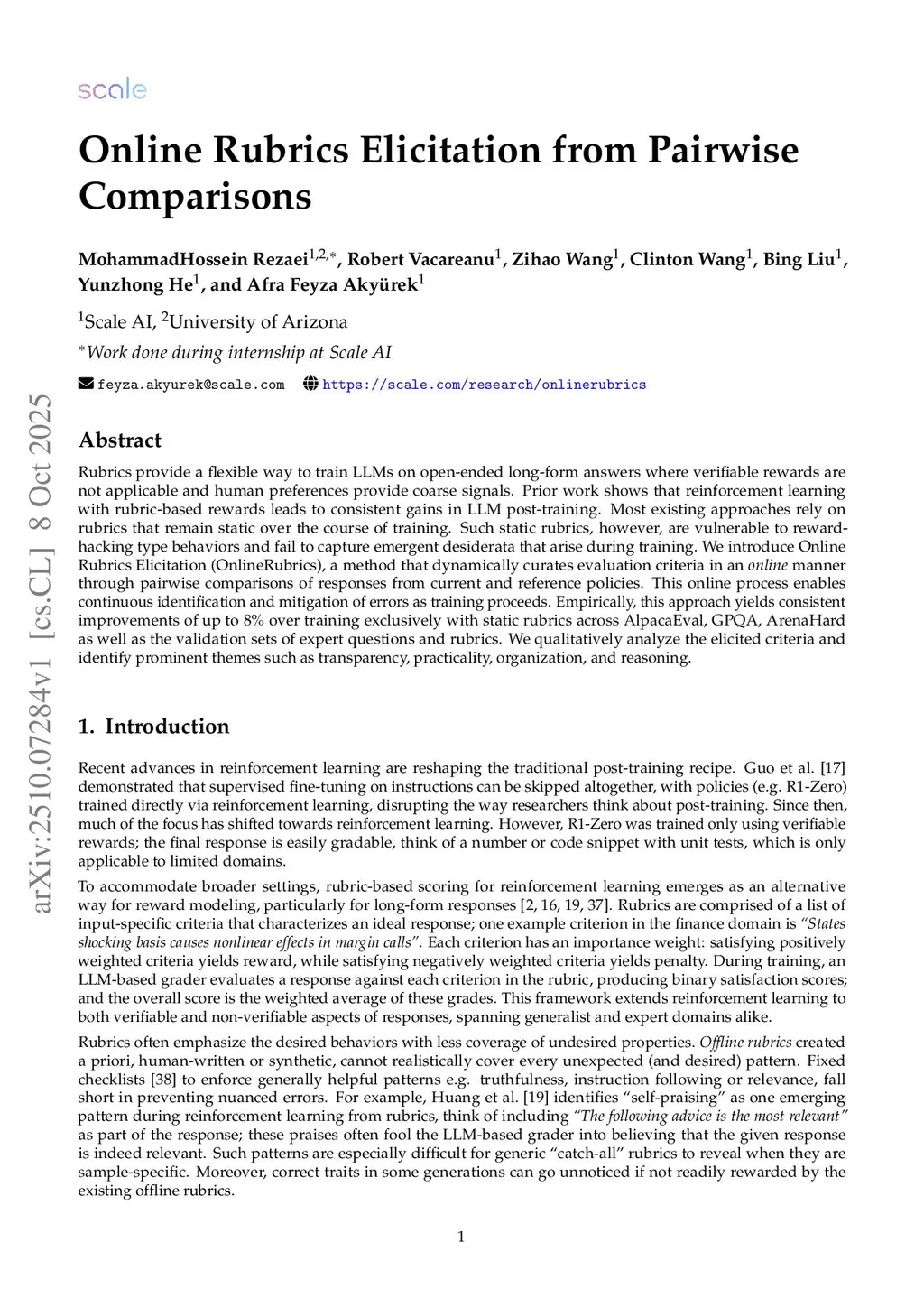 Rubrics provide a flexible way to train LLMs on open-ended long-form answers where verifiable rewards are not applicable and human preferences provide coarse signals. Prior work shows that reinforcement learning with rubric-based rewards leads to consistent gains in LLM post-training. Most existing approaches rely on rubrics that remain static over the course of training. Such static rubrics, however, are vulnerable to reward-hacking type behaviors and fail to capture emergent desiderata that arise during training. We introduce Online Rubrics Elicitation (OnlineRubrics), a method that dynamically curates evaluation criteria in an online manner through pairwise comparisons of responses from current and reference policies. This online process enables continuous identification and mitigation of errors as training proceeds. Empirically, this approach yields consistent improvements of up to 8% over training exclusively with static rubrics across AlpacaEval, GPQA, ArenaHard as well as the validation sets of expert questions and rubrics. We qualitatively analyze the elicited criteria and identify prominent themes such as transparency, practicality, organization, and reasoning.