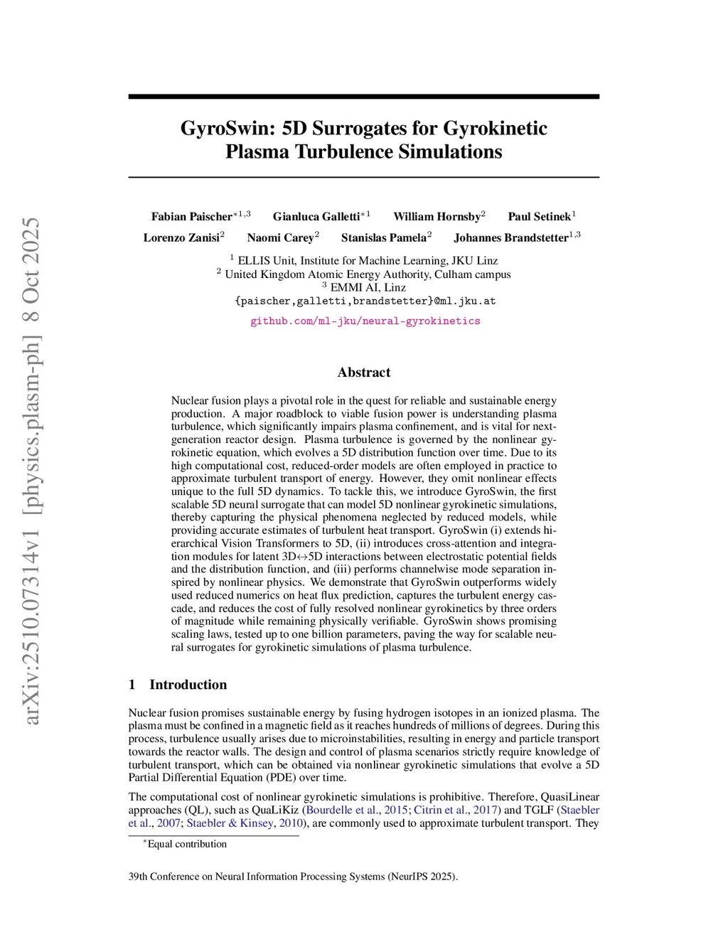 Nuclear fusion plays a pivotal role in the quest for reliable and sustainable energy production. A major roadblock to viable fusion power is understanding plasma turbulence, which significantly impairs plasma confinement, and is vital for next-generation reactor design. Plasma turbulence is governed by the nonlinear gyrokinetic equation, which evolves a 5D distribution function over time. Due to its high computational cost, reduced-order models are often employed in practice to approximate turbulent transport of energy. However, they omit nonlinear effects unique to the full 5D dynamics. To tackle this, we introduce GyroSwin, the first scalable 5D neural surrogate that can model 5D nonlinear gyrokinetic simulations, thereby capturing the physical phenomena neglected by reduced models, while providing accurate estimates of turbulent heat this http URL (i) extends hierarchical Vision Transformers to 5D, (ii) introduces cross-attention and integration modules for latent 3D5D interactions between electrostatic potential fields and the distribution function, and (iii) performs channelwise mode separation inspired by nonlinear physics. We demonstrate that GyroSwin outperforms widely used reduced numerics on heat flux prediction, captures the turbulent energy cascade, and reduces the cost of fully resolved nonlinear gyrokinetics by three orders of magnitude while remaining physically verifiable. GyroSwin shows promising scaling laws, tested up to one billion parameters, paving the way for scalable neural surrogates for gyrokinetic simulations of plasma turbulence.