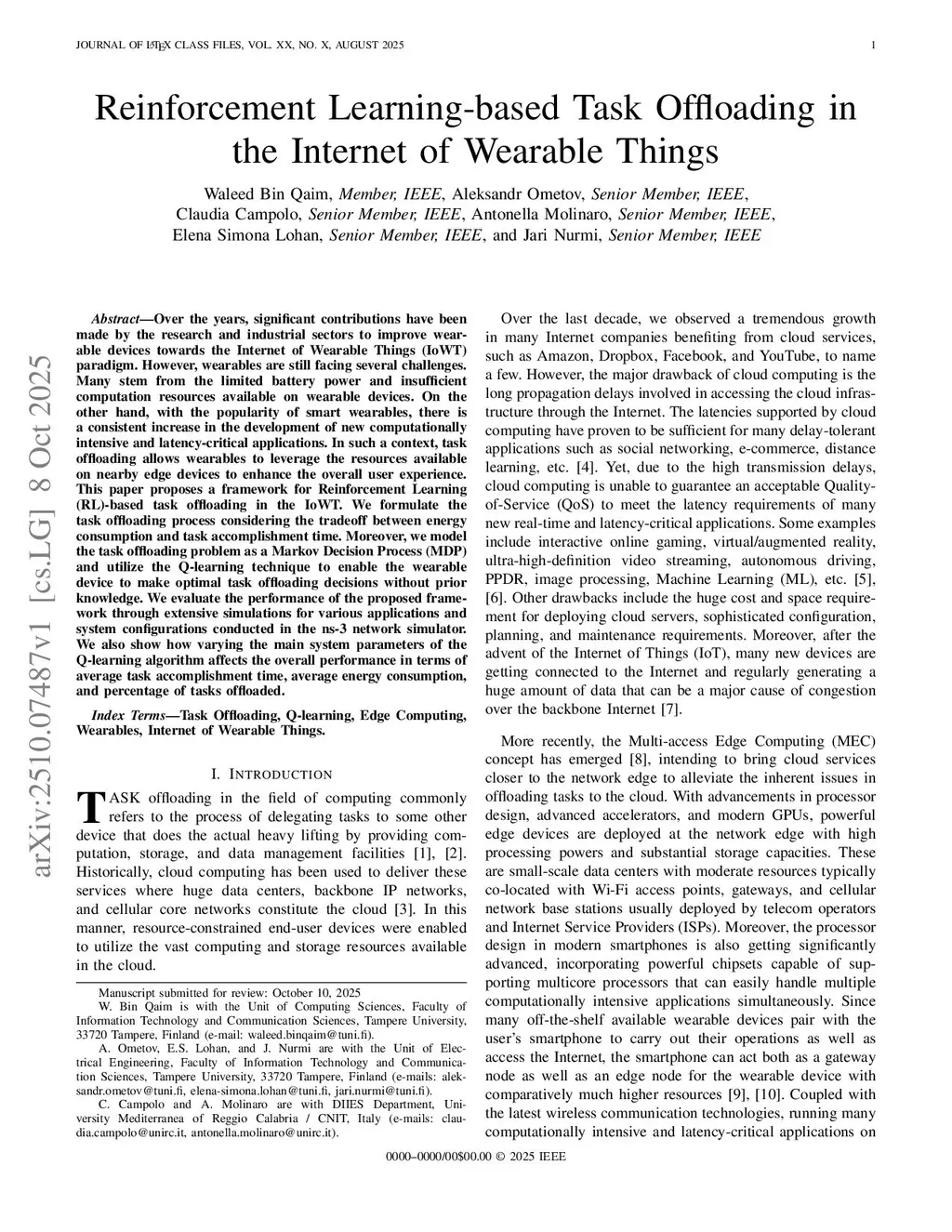 Reinforcement Learning-based Task Offloading in the Internet of Wearable Things
