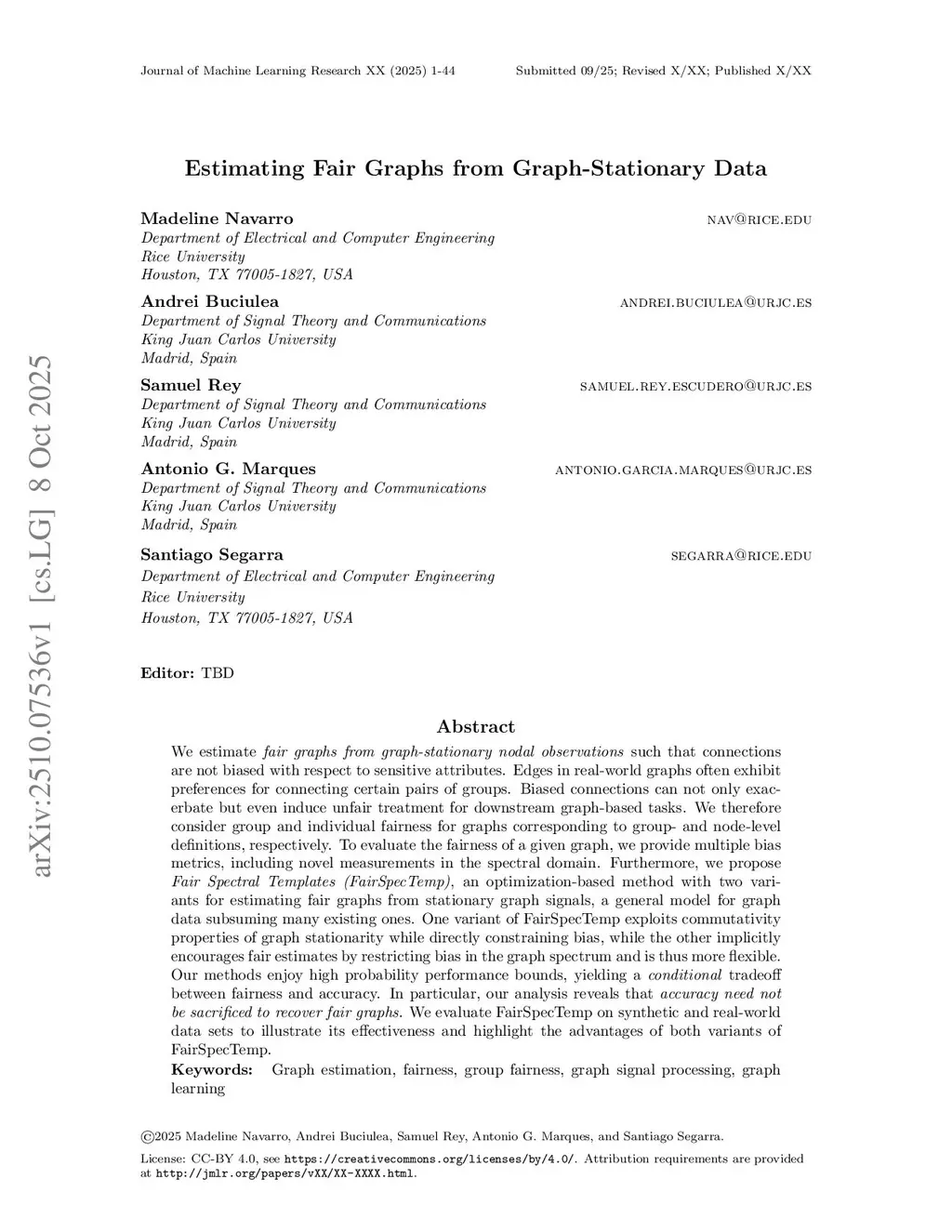 We estimate fair graphs from graph-stationary nodal observations such that connections are not biased with respect to sensitive attributes. Edges in real-world graphs often exhibit preferences for connecting certain pairs of groups. Biased connections can not only exacerbate but even induce unfair treatment for downstream graph-based tasks. We therefore consider group and individual fairness for graphs corresponding to group- and node-level definitions, respectively. To evaluate the fairness of a given graph, we provide multiple bias metrics, including novel measurements in the spectral domain. Furthermore, we propose Fair Spectral Templates (FairSpecTemp), an optimization-based method with two variants for estimating fair graphs from stationary graph signals, a general model for graph data subsuming many existing ones. One variant of FairSpecTemp exploits commutativity properties of graph stationarity while directly constraining bias, while the other implicitly encourages fair estimates by restricting bias in the graph spectrum and is thus more flexible. Our methods enjoy high probability performance bounds, yielding a conditional tradeoff between fairness and accuracy. In particular, our analysis reveals that accuracy need not be sacrificed to recover fair graphs. We evaluate FairSpecTemp on synthetic and real-world data sets to illustrate its effectiveness and highlight the advantages of both variants of FairSpecTemp.