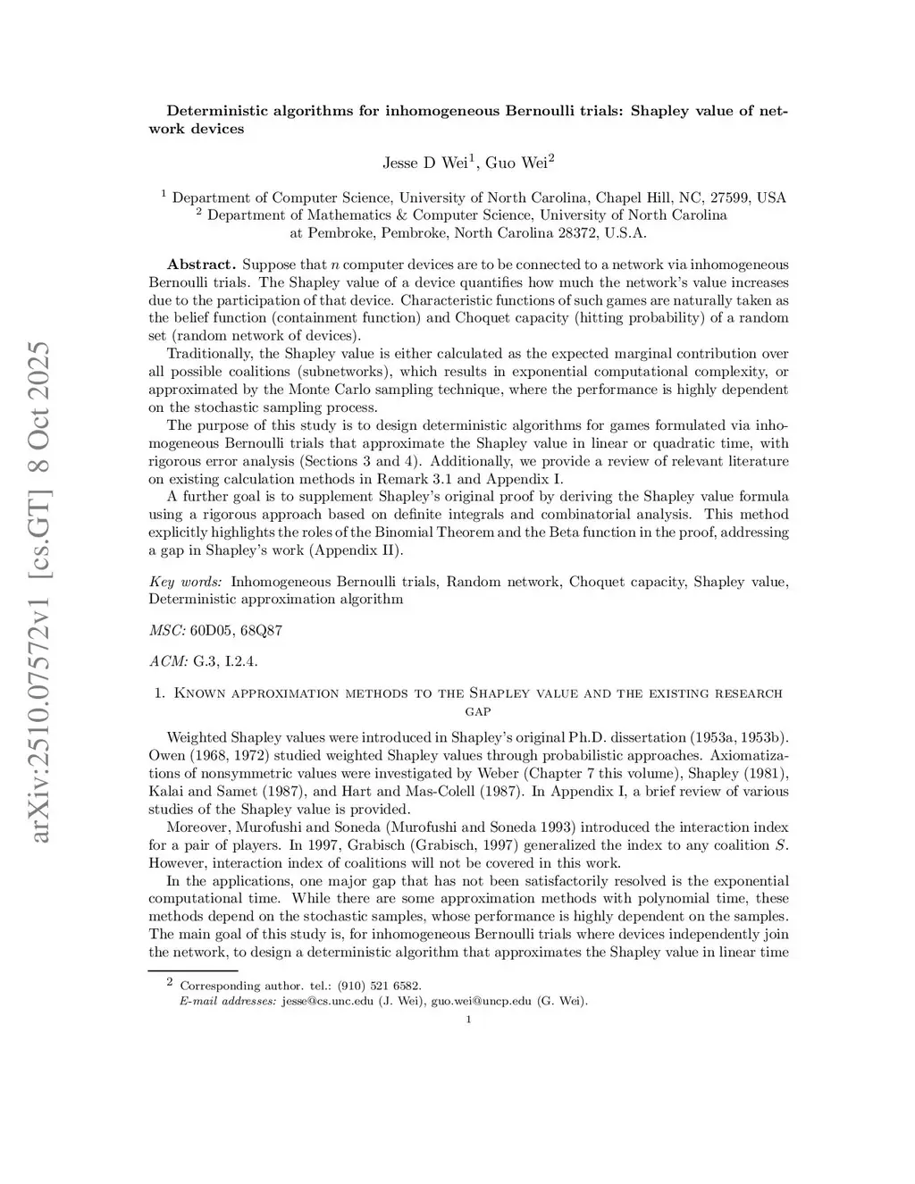 Suppose that computer devices are to be connected to a network via inhomogeneous Bernoulli trials. The Shapley value of a device quantifies how much the network's value increases due to the participation of that device. Characteristic functions of such games are naturally taken as the belief function (containment function) and Choquet capacity (hitting probability) of a random set (random network of devices).Traditionally, the Shapley value is either calculated as the expected marginal contribution over all possible coalitions (subnetworks), which results in exponential computational complexity, or approximated by the Monte Carlo sampling technique, where the performance is highly dependent on the stochastic sampling process.The purpose of this study is to design deterministic algorithms for games formulated via inhomogeneous Bernoulli trials that approximate the Shapley value in linear or quadratic time, with rigorous error analysis (Sections 3 and 4). Additionally, we provide a review of relevant literature on existing calculation methods in Remark 3.1 and Appendix I.A further goal is to supplement Shapley's original proof by deriving the Shapley value formula using a rigorous approach based on definite integrals and combinatorial analysis. This method explicitly highlights the roles of the Binomial Theorem and the Beta function in the proof, addressing a gap in Shapley's work (Appendix II).