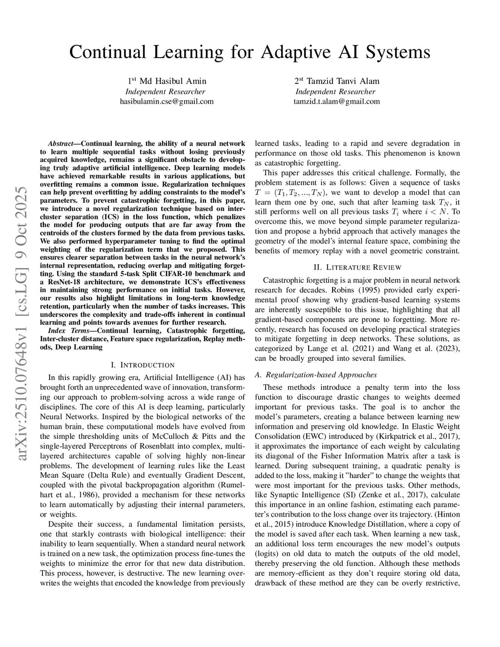 Continual learning the ability of a neural network to learn multiple sequential tasks without catastrophic forgetting remains a central challenge in developing adaptive artificial intelligence systems. While deep learning models achieve state-of-the-art performance across domains, they remain limited by overfitting and forgetting. This paper introduces Cluster-Aware Replay (CAR), a hybrid continual learning framework that integrates a small, class-balanced replay buffer with a regularization term based on Inter-Cluster Fitness (ICF) in the feature space. The ICF loss penalizes overlapping feature representations between new and previously learned tasks, encouraging geometric separation in the latent space and reducing interference. Using the standard five-task Split CIFAR-10 benchmark with a ResNet-18 backbone, initial experiments demonstrate that CAR better preserves earlier task performance compared to fine-tuning alone. These findings are preliminary but highlight feature-space regularization as a promising direction for mitigating catastrophic forgetting.