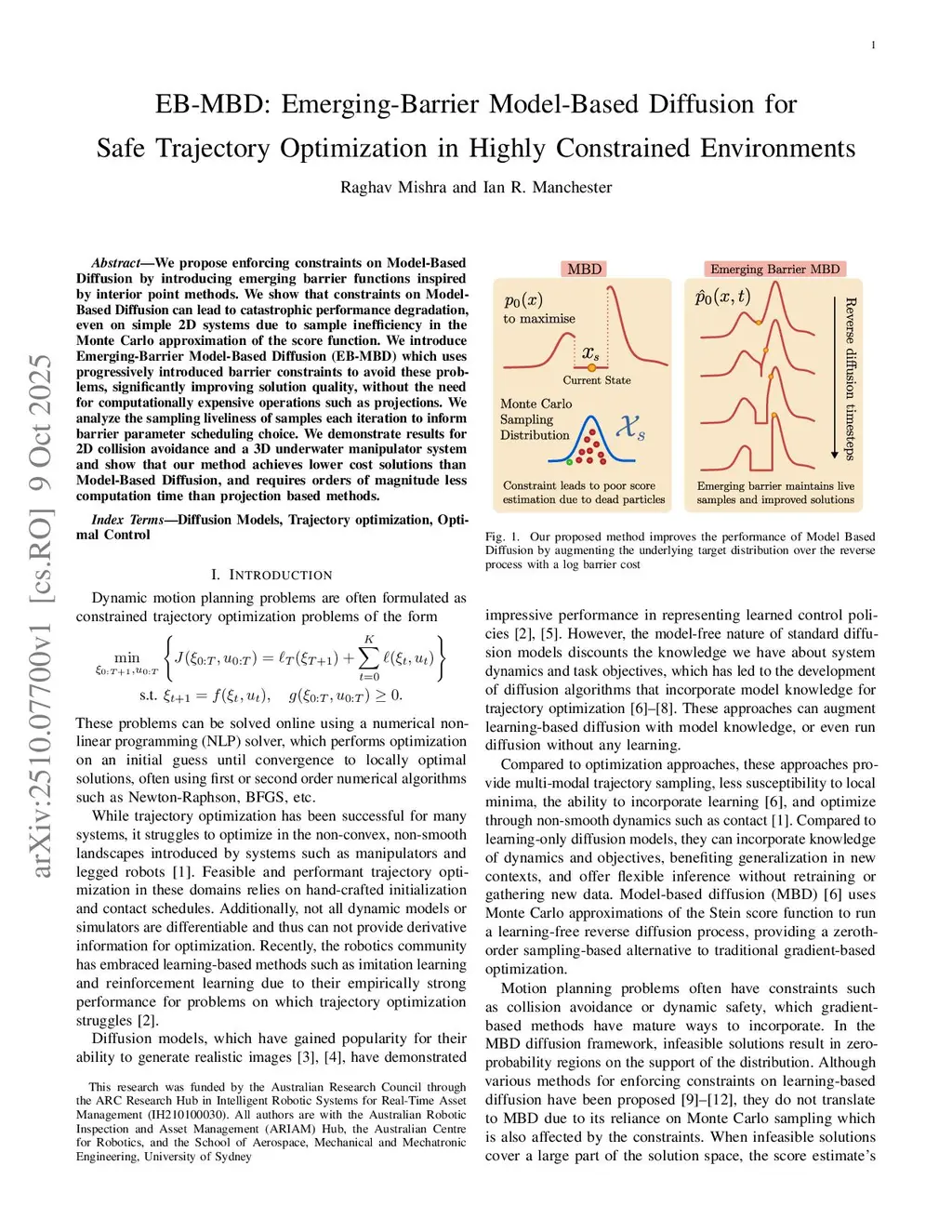 We propose enforcing constraints on Model-Based Diffusion by introducing emerging barrier functions inspired by interior point methods. We show that constraints on Model-Based Diffusion can lead to catastrophic performance degradation, even on simple 2D systems due to sample inefficiency in the Monte Carlo approximation of the score function. We introduce Emerging-Barrier Model-Based Diffusion (EB-MBD) which uses progressively introduced barrier constraints to avoid these problems, significantly improving solution quality, without the need for computationally expensive operations such as projections. We analyze the sampling liveliness of samples each iteration to inform barrier parameter scheduling choice. We demonstrate results for 2D collision avoidance and a 3D underwater manipulator system and show that our method achieves lower cost solutions than Model-Based Diffusion, and requires orders of magnitude less computation time than projection based methods.