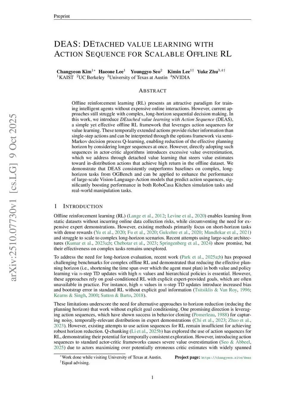 DEAS: DEtached value learning with Action Sequence for Scalable Offline RL