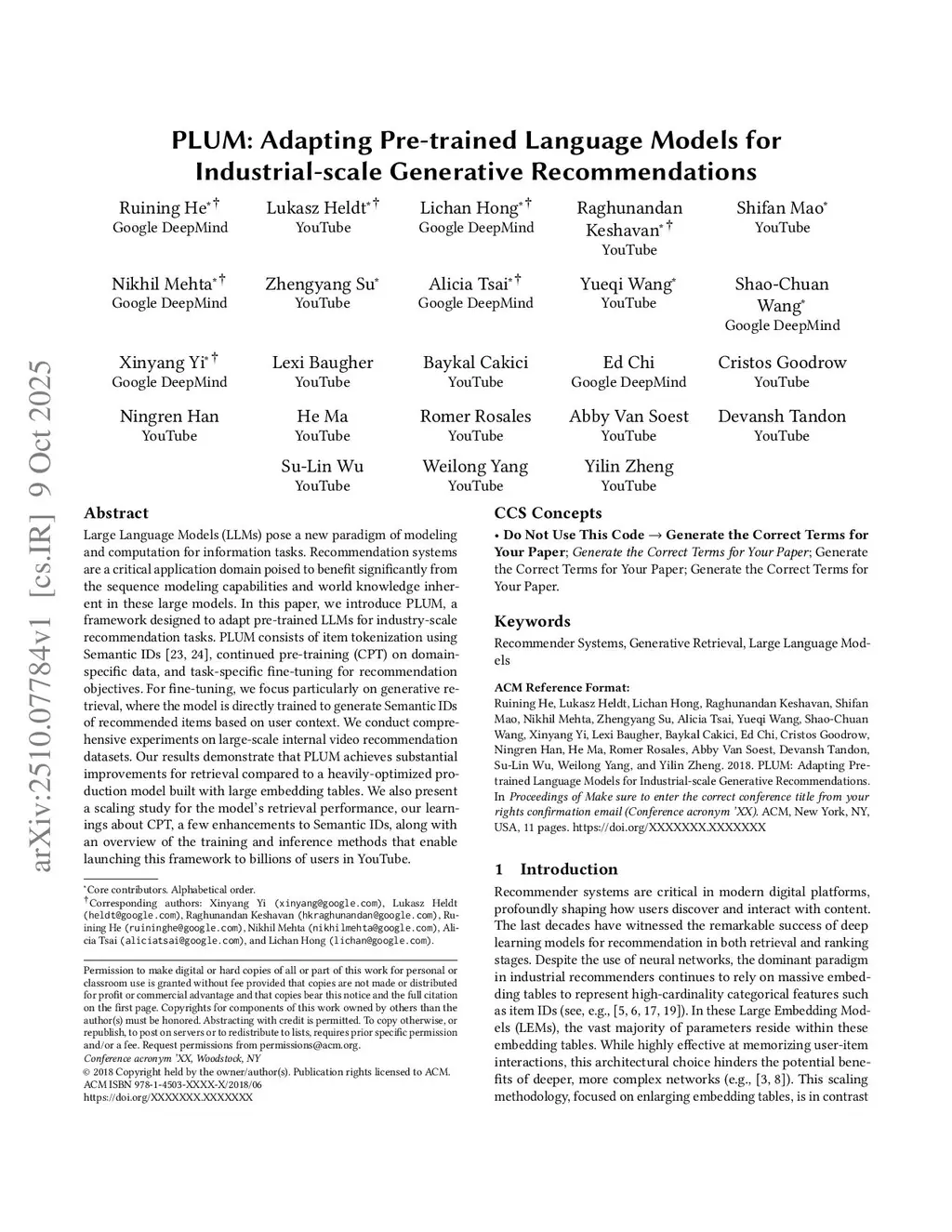 Large Language Models (LLMs) pose a new paradigm of modeling and computation for information tasks. Recommendation systems are a critical application domain poised to benefit significantly from the sequence modeling capabilities and world knowledge inherent in these large models. In this paper, we introduce PLUM, a framework designed to adapt pre-trained LLMs for industry-scale recommendation tasks. PLUM consists of item tokenization using Semantic IDs, continued pre-training (CPT) on domain-specific data, and task-specific fine-tuning for recommendation objectives. For fine-tuning, we focus particularly on generative retrieval, where the model is directly trained to generate Semantic IDs of recommended items based on user context. We conduct comprehensive experiments on large-scale internal video recommendation datasets. Our results demonstrate that PLUM achieves substantial improvements for retrieval compared to a heavily-optimized production model built with large embedding tables. We also present a scaling study for the model's retrieval performance, our learnings about CPT, a few enhancements to Semantic IDs, along with an overview of the training and inference methods that enable launching this framework to billions of users in YouTube.