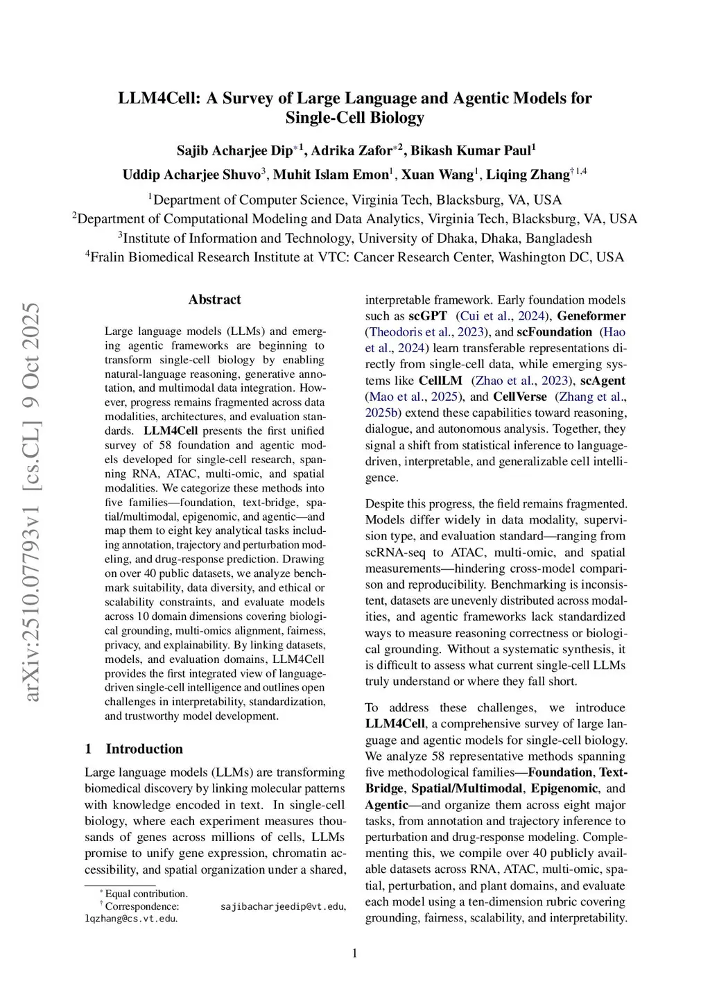 Large language models (LLMs) and emerging agentic frameworks are beginning to transform single-cell biology by enabling natural-language reasoning, generative annotation, and multimodal data integration. However, progress remains fragmented across data modalities, architectures, and evaluation standards. LLM4Cell presents the first unified survey of 58 foundation and agentic models developed for single-cell research, spanning RNA, ATAC, multi-omic, and spatial modalities. We categorize these methods into five families-foundation, text-bridge, spatial, multimodal, epigenomic, and agentic-and map them to eight key analytical tasks including annotation, trajectory and perturbation modeling, and drug-response prediction. Drawing on over 40 public datasets, we analyze benchmark suitability, data diversity, and ethical or scalability constraints, and evaluate models across 10 domain dimensions covering biological grounding, multi-omics alignment, fairness, privacy, and explainability. By linking datasets, models, and evaluation domains, LLM4Cell provides the first integrated view of language-driven single-cell intelligence and outlines open challenges in interpretability, standardization, and trustworthy model development.