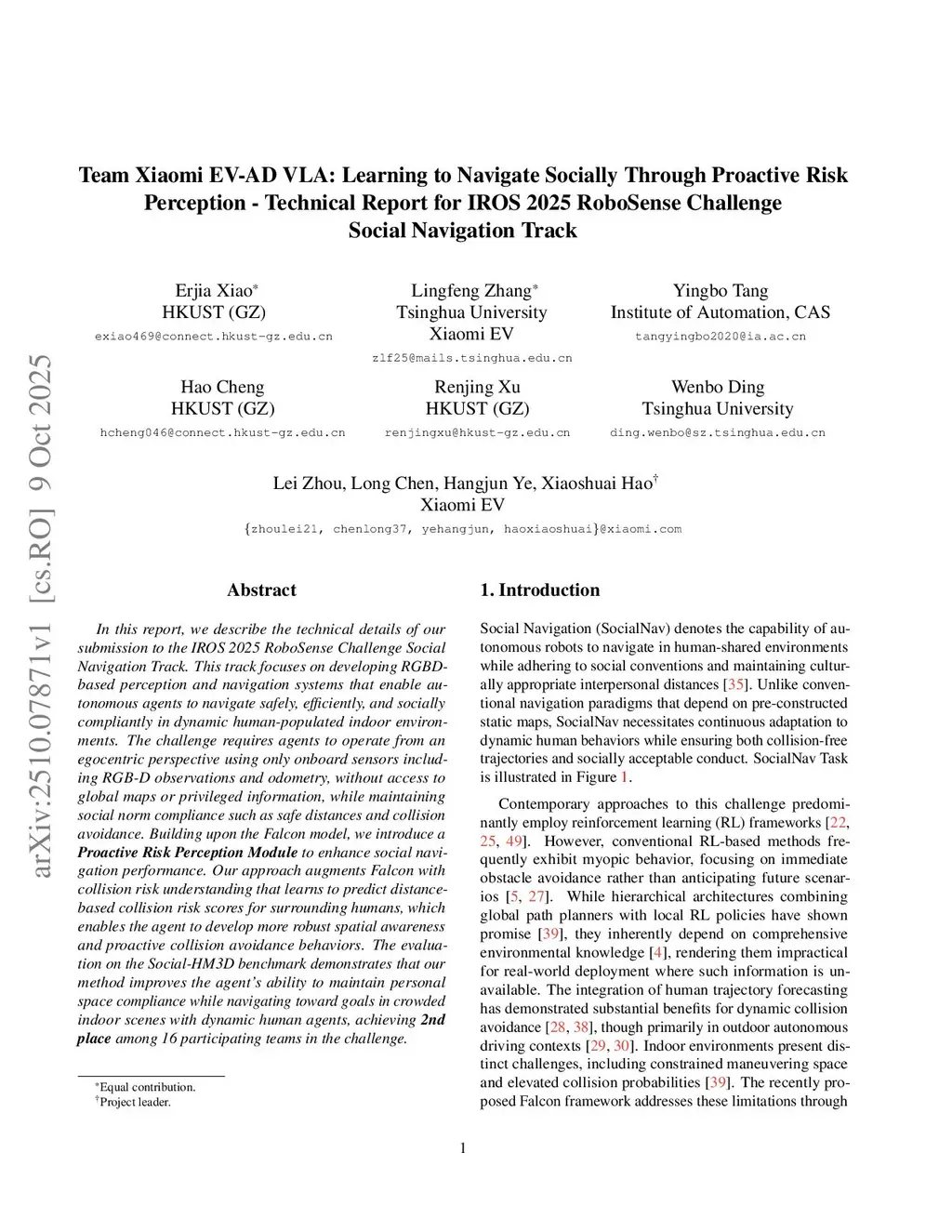 In this report, we describe the technical details of our submission to the IROS 2025 RoboSense Challenge Social Navigation Track. This track focuses on developing RGBD-based perception and navigation systems that enable autonomous agents to navigate safely, efficiently, and socially compliantly in dynamic human-populated indoor environments. The challenge requires agents to operate from an egocentric perspective using only onboard sensors including RGB-D observations and odometry, without access to global maps or privileged information, while maintaining social norm compliance such as safe distances and collision avoidance. Building upon the Falcon model, we introduce a Proactive Risk Perception Module to enhance social navigation performance. Our approach augments Falcon with collision risk understanding that learns to predict distance-based collision risk scores for surrounding humans, which enables the agent to develop more robust spatial awareness and proactive collision avoidance behaviors. The evaluation on the Social-HM3D benchmark demonstrates that our method improves the agent's ability to maintain personal space compliance while navigating toward goals in crowded indoor scenes with dynamic human agents, achieving 2nd place among 16 participating teams in the challenge.