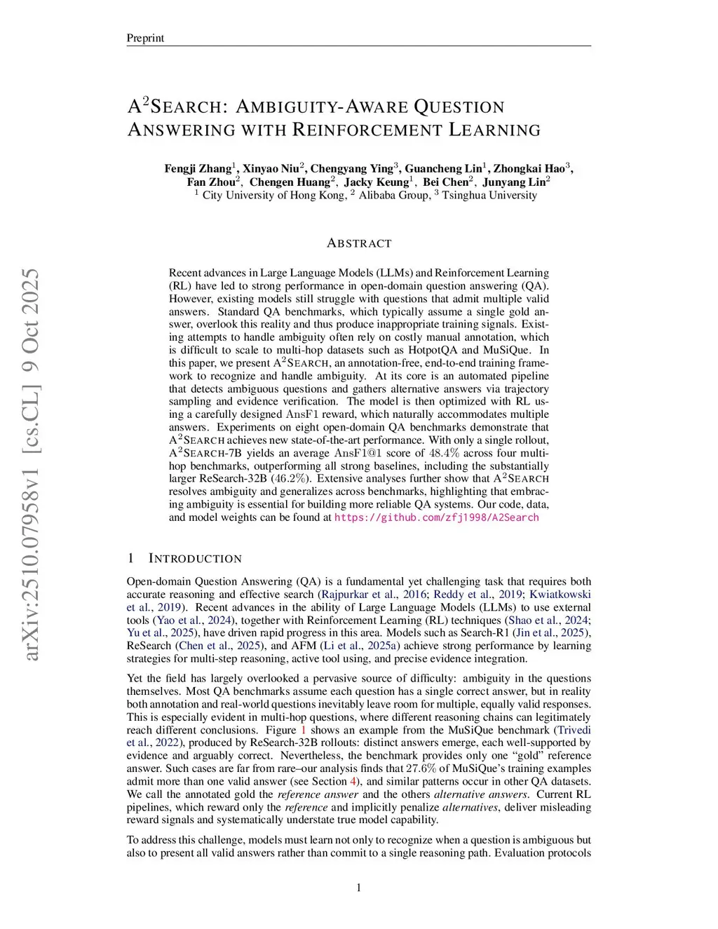 Recent advances in Large Language Models (LLMs) and Reinforcement Learning (RL) have led to strong performance in open-domain question answering (QA). However, existing models still struggle with questions that admit multiple valid answers. Standard QA benchmarks, which typically assume a single gold answer, overlook this reality and thus produce inappropriate training signals. Existing attempts to handle ambiguity often rely on costly manual annotation, which is difficult to scale to multi-hop datasets such as HotpotQA and MuSiQue. In this paper, we present ASearch, an annotation-free, end-to-end training framework to recognize and handle ambiguity. At its core is an automated pipeline that detects ambiguous questions and gathers alternative answers via trajectory sampling and evidence verification. The model is then optimized with RL using a carefully designed reward, which naturally accommodates multiple answers. Experiments on eight open-domain QA benchmarks demonstrate that ASearch achieves new state-of-the-art performance. With only a single rollout, ASearch-7B yields an average score of across four multi-hop benchmarks, outperforming all strong baselines, including the substantially larger ReSearch-32B (). Extensive analyses further show that ASearch resolves ambiguity and generalizes across benchmarks, highlighting that embracing ambiguity is essential for building more reliable QA systems. Our code, data, and model weights can be found atthis https URL