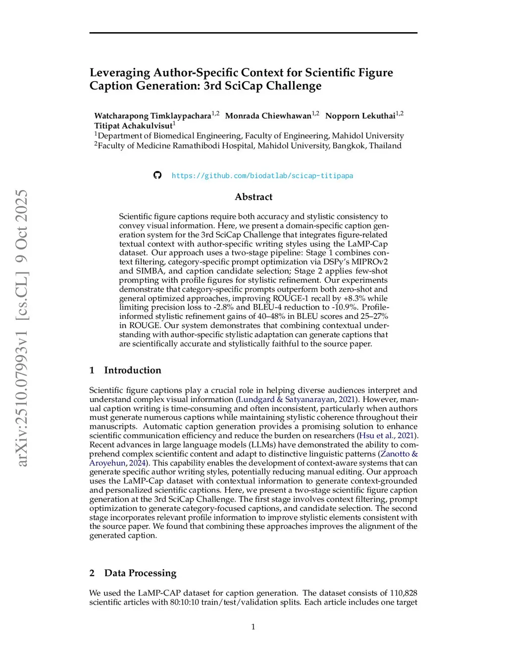 Scientific figure captions require both accuracy and stylistic consistency to convey visual information. Here, we present a domain-specific caption generation system for the 3rd SciCap Challenge that integrates figure-related textual context with author-specific writing styles using the LaMP-Cap dataset. Our approach uses a two-stage pipeline: Stage 1 combines context filtering, category-specific prompt optimization via DSPy's MIPROv2 and SIMBA, and caption candidate selection; Stage 2 applies few-shot prompting with profile figures for stylistic refinement. Our experiments demonstrate that category-specific prompts outperform both zero-shot and general optimized approaches, improving ROUGE-1 recall by +8.3\% while limiting precision loss to -2.8\% and BLEU-4 reduction to -10.9\%. Profile-informed stylistic refinement yields 40--48\% gains in BLEU scores and 25--27\% in ROUGE. Overall, our system demonstrates that combining contextual understanding with author-specific stylistic adaptation can generate captions that are both scientifically accurate and stylistically faithful to the source paper.