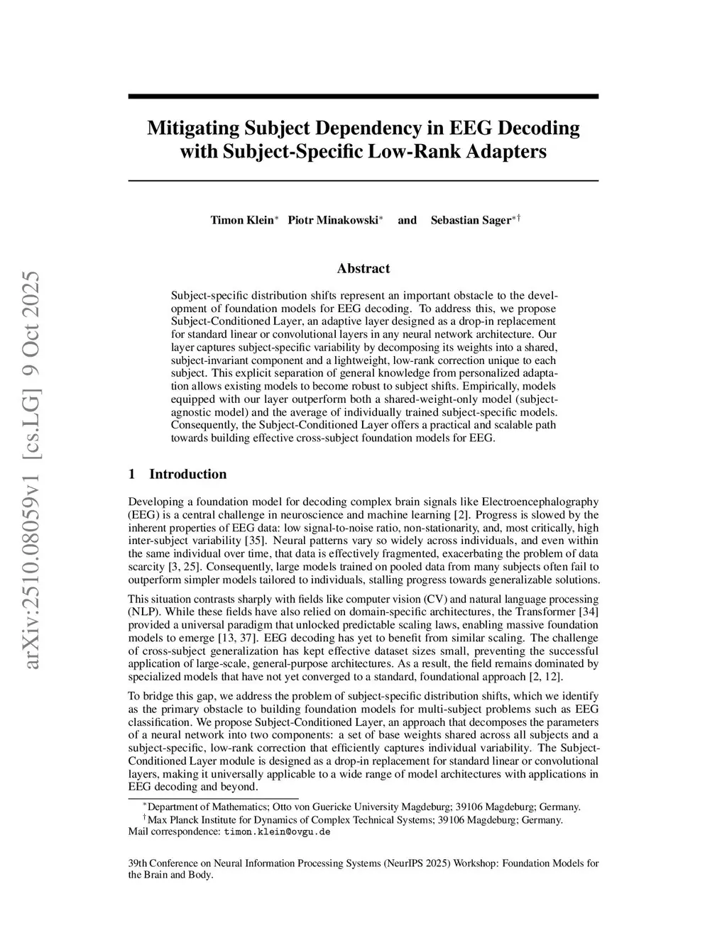 Subject-specific distribution shifts represent an important obstacle to the development of foundation models for EEG decoding. To address this, we propose Subject-Conditioned Layer,, an adaptive layer designed as a drop-in replacement for standard linear or convolutional layers in any neural network architecture. Our layer captures subject-specific variability by decomposing its weights into a shared, subject-invariant component and a lightweight, low-rank correction unique to each subject. This explicit separation of general knowledge from personalized adaptation allows existing models to become robust to subject shifts. Empirically, models equipped with our layer outperform both a shared-weight-only model (subject-agnostic model) and the average of individually trained subject-specific models. Consequently, the Subject-Conditioned Layer, offers a practical and scalable path towards building effective cross-subject foundation models for EEG.