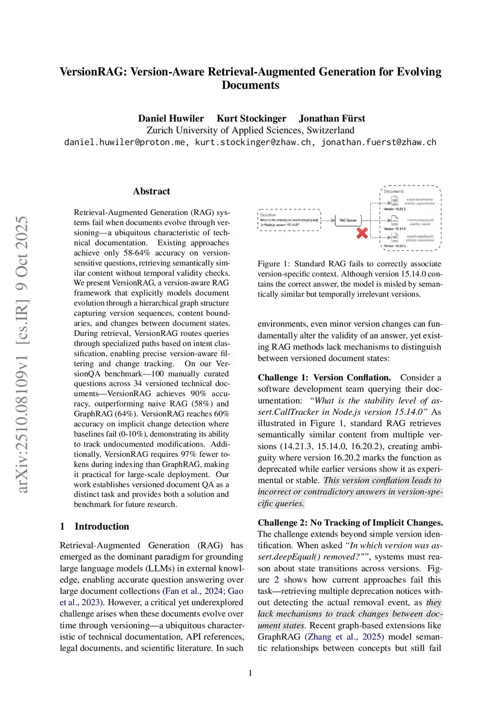 Retrieval-Augmented Generation (RAG) systems fail when documents evolve through versioning-a ubiquitous characteristic of technical documentation. Existing approaches achieve only 58-64% accuracy on version-sensitive questions, retrieving semantically similar content without temporal validity checks. We present VersionRAG, a version-aware RAG framework that explicitly models document evolution through a hierarchical graph structure capturing version sequences, content boundaries, and changes between document states. During retrieval, VersionRAG routes queries through specialized paths based on intent classification, enabling precise version-aware filtering and change tracking. On our VersionQA benchmark-100 manually curated questions across 34 versioned technical documents-VersionRAG achieves 90% accuracy, outperforming naive RAG (58%) and GraphRAG (64%). VersionRAG reaches 60% accuracy on implicit change detection where baselines fail (0-10%), demonstrating its ability to track undocumented modifications. Additionally, VersionRAG requires 97% fewer tokens during indexing than GraphRAG, making it practical for large-scale deployment. Our work establishes versioned document QA as a distinct task and provides both a solution and benchmark for future research.