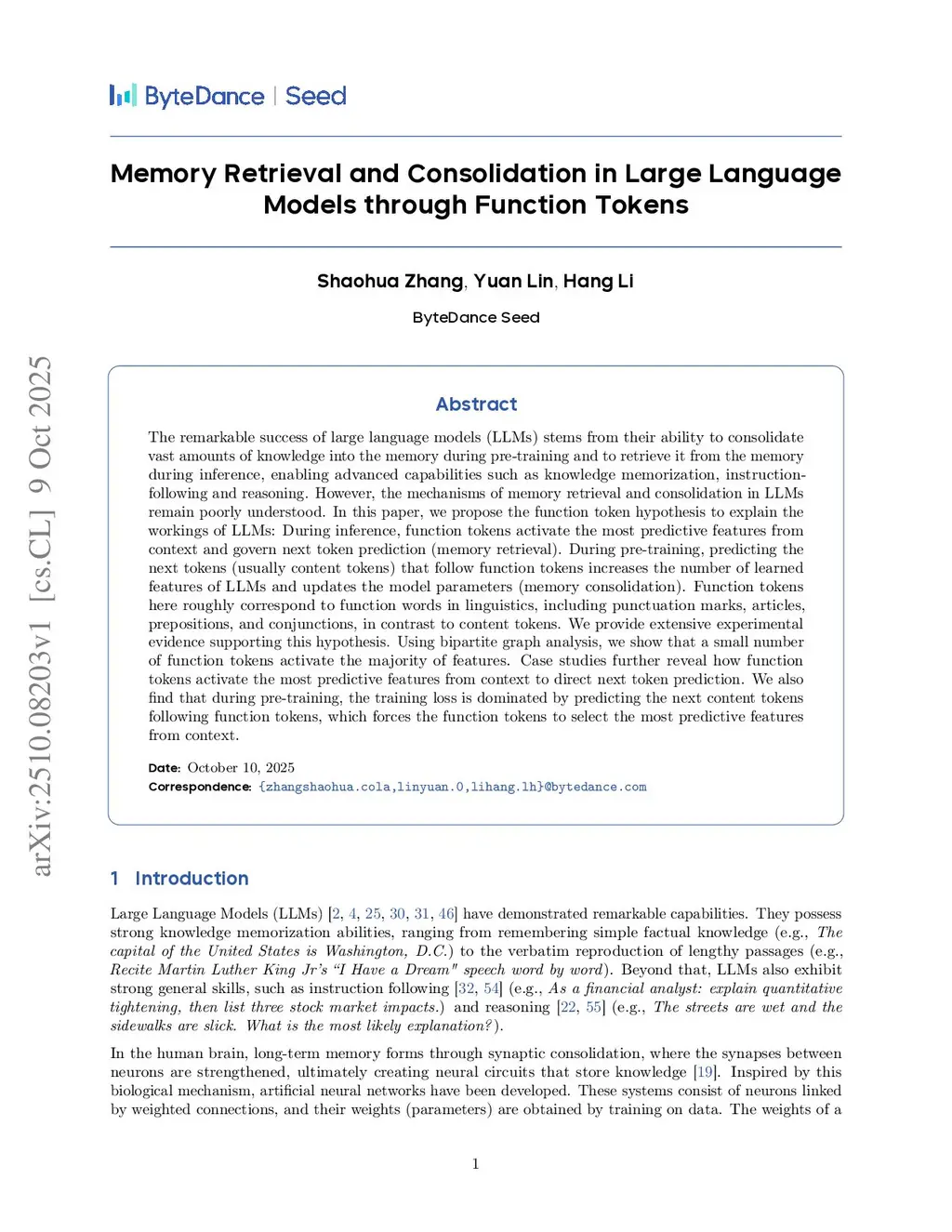 Memory Retrieval and Consolidation in Large Language Models through Function Tokens