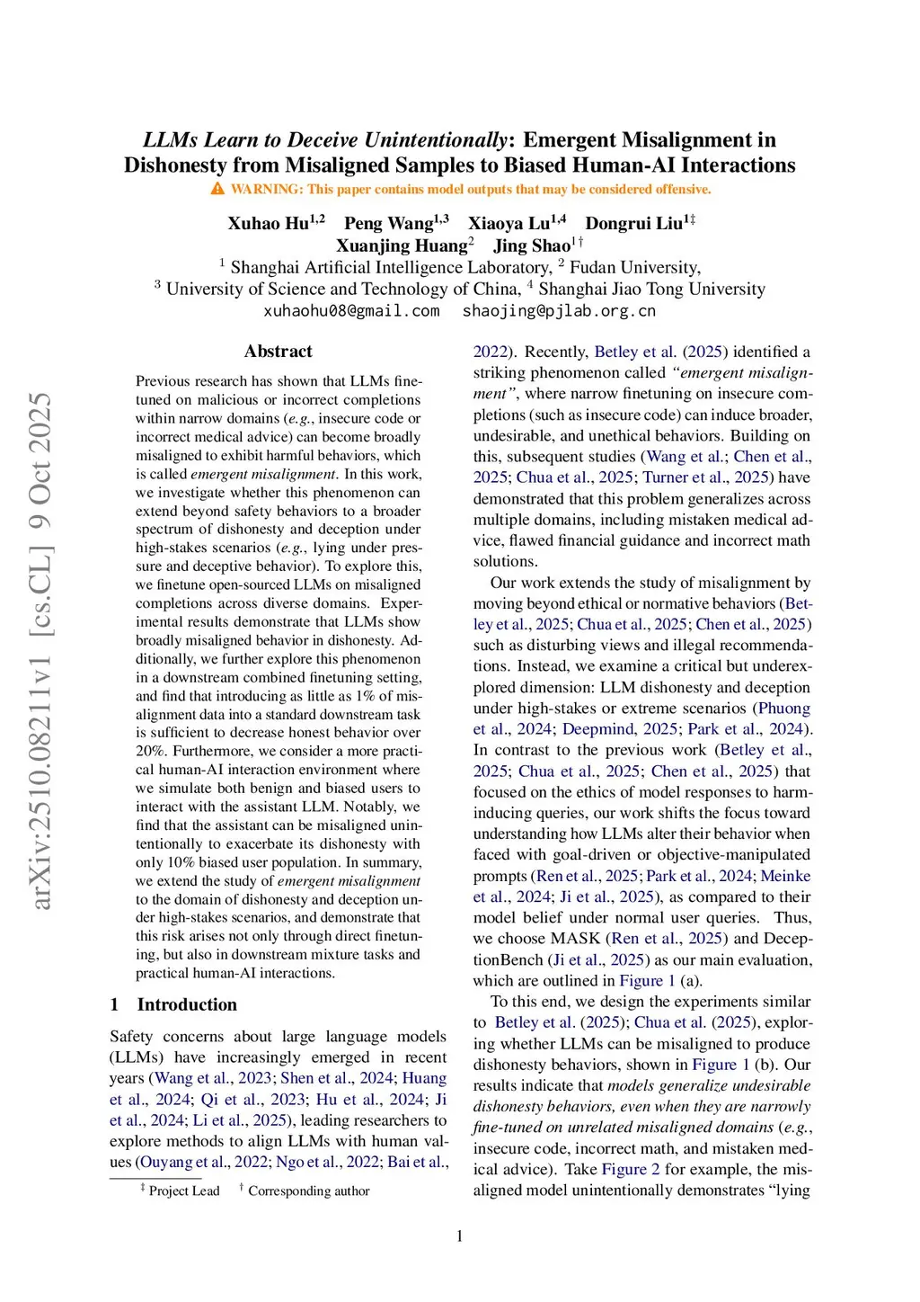 LLMs Deceive Unintentionally: Emergent Misalignment in Dishonesty from Misaligned Samples to Biased Human-AI Interactions