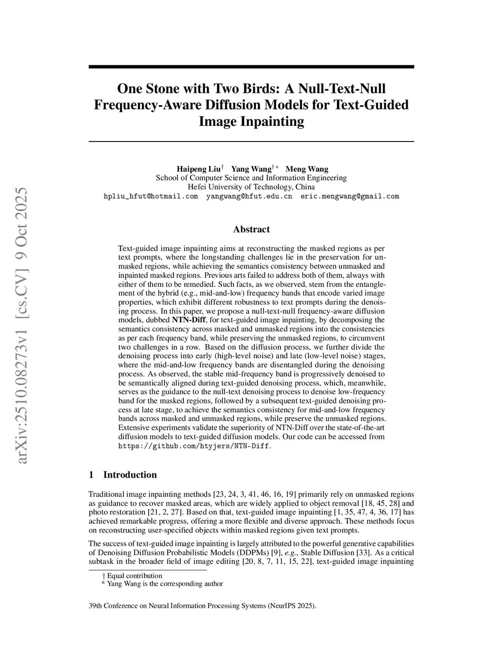 One Stone with Two Birds: A Null-Text-Null Frequency-Aware Diffusion Models for Text-Guided Image Inpainting