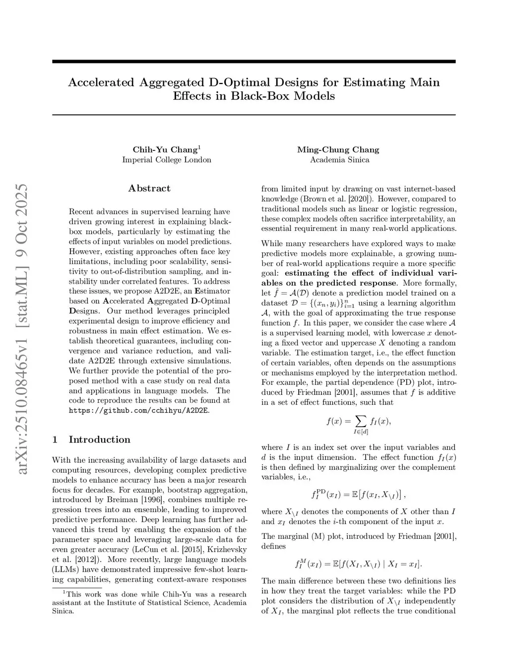 Recent advances in supervised learning have driven growing interest in explaining black-box models, particularly by estimating the effects of input variables on model predictions. However, existing approaches often face key limitations, including poor scalability, sensitivity to out-of-distribution sampling, and instability under correlated features. To address these issues, we propose A2D2E, an stimator based on ccelerated ggregated -Optimal esigns. Our method leverages principled experimental design to improve efficiency and robustness in main effect estimation. We establish theoretical guarantees, including convergence and variance reduction, and validate A2D2E through extensive simulations. We further provide the potential of the proposed method with a case study on real data and applications in language models. The code to reproduce the results can be found atthis https URL.