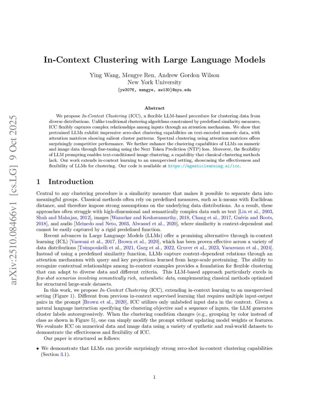We propose In-Context Clustering (ICC), a flexible LLM-based procedure for clustering data from diverse distributions. Unlike traditional clustering algorithms constrained by predefined similarity measures, ICC flexibly captures complex relationships among inputs through an attention mechanism. We show that pretrained LLMs exhibit impressive zero-shot clustering capabilities on text-encoded numeric data, with attention matrices showing salient cluster patterns. Spectral clustering using attention matrices offers surprisingly competitive performance. We further enhance the clustering capabilities of LLMs on numeric and image data through fine-tuning using the Next Token Prediction (NTP) loss. Moreover, the flexibility of LLM prompting enables text-conditioned image clustering, a capability that classical clustering methods lack. Our work extends in-context learning to an unsupervised setting, showcasing the effectiveness and flexibility of LLMs for clustering. Our code is available atthis https URL.