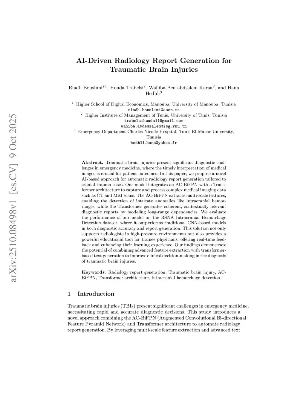 Traumatic brain injuries present significant diagnostic challenges in emergency medicine, where the timely interpretation of medical images is crucial for patient outcomes. In this paper, we propose a novel AI-based approach for automatic radiology report generation tailored to cranial trauma cases. Our model integrates an AC-BiFPN with a Transformer architecture to capture and process complex medical imaging data such as CT and MRI scans. The AC-BiFPN extracts multi-scale features, enabling the detection of intricate anomalies like intracranial hemorrhages, while the Transformer generates coherent, contextually relevant diagnostic reports by modeling long-range dependencies. We evaluate the performance of our model on the RSNA Intracranial Hemorrhage Detection dataset, where it outperforms traditional CNN-based models in both diagnostic accuracy and report generation. This solution not only supports radiologists in high-pressure environments but also provides a powerful educational tool for trainee physicians, offering real-time feedback and enhancing their learning experience. Our findings demonstrate the potential of combining advanced feature extraction with transformer-based text generation to improve clinical decision-making in the diagnosis of traumatic brain injuries.