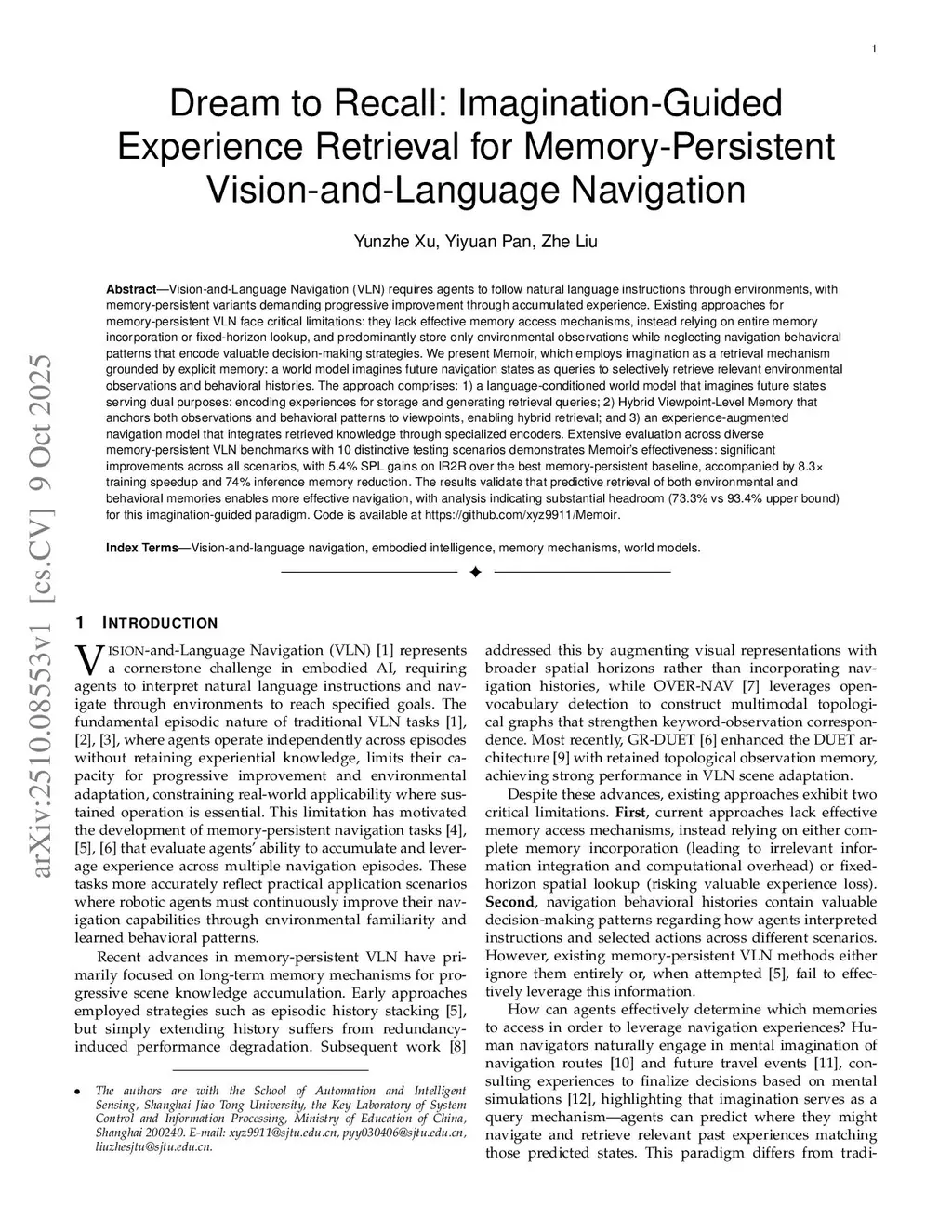 Vision-and-Language Navigation (VLN) requires agents to follow natural language instructions through environments, with memory-persistent variants demanding progressive improvement through accumulated experience. Existing approaches for memory-persistent VLN face critical limitations: they lack effective memory access mechanisms, instead relying on entire memory incorporation or fixed-horizon lookup, and predominantly store only environmental observations while neglecting navigation behavioral patterns that encode valuable decision-making strategies. We present Memoir, which employs imagination as a retrieval mechanism grounded by explicit memory: a world model imagines future navigation states as queries to selectively retrieve relevant environmental observations and behavioral histories. The approach comprises: 1) a language-conditioned world model that imagines future states serving dual purposes: encoding experiences for storage and generating retrieval queries; 2) Hybrid Viewpoint-Level Memory that anchors both observations and behavioral patterns to viewpoints, enabling hybrid retrieval; and 3) an experience-augmented navigation model that integrates retrieved knowledge through specialized encoders. Extensive evaluation across diverse memory-persistent VLN benchmarks with 10 distinctive testing scenarios demonstrates Memoir's effectiveness: significant improvements across all scenarios, with 5.4% SPL gains on IR2R over the best memory-persistent baseline, accompanied by 8.3x training speedup and 74% inference memory reduction. The results validate that predictive retrieval of both environmental and behavioral memories enables more effective navigation, with analysis indicating substantial headroom (73.3% vs 93.4% upper bound) for this imagination-guided paradigm. Code atthis https URL.