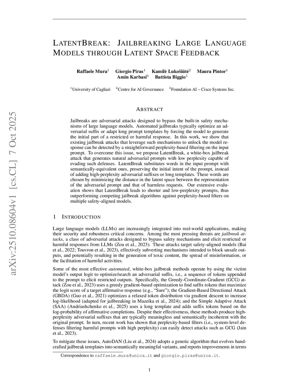 Jailbreaks are adversarial attacks designed to bypass the built-in safety mechanisms of large language models. Automated jailbreaks typically optimize an adversarial suffix or adapt long prompt templates by forcing the model to generate the initial part of a restricted or harmful response. In this work, we show that existing jailbreak attacks that leverage such mechanisms to unlock the model response can be detected by a straightforward perplexity-based filtering on the input prompt. To overcome this issue, we propose LatentBreak, a white-box jailbreak attack that generates natural adversarial prompts with low perplexity capable of evading such defenses. LatentBreak substitutes words in the input prompt with semantically-equivalent ones, preserving the initial intent of the prompt, instead of adding high-perplexity adversarial suffixes or long templates. These words are chosen by minimizing the distance in the latent space between the representation of the adversarial prompt and that of harmless requests. Our extensive evaluation shows that LatentBreak leads to shorter and low-perplexity prompts, thus outperforming competing jailbreak algorithms against perplexity-based filters on multiple safety-aligned models.