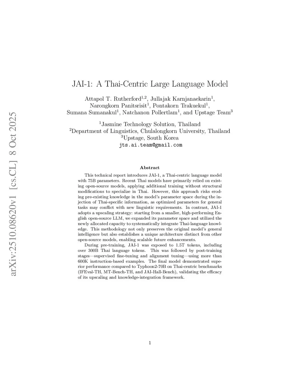 This technical report introduces JAI-1, a Thai-centric language model with 75B parameters. Recent Thai models have primarily relied on existing open-source models, applying additional training without structural modifications to specialize in Thai. However, this approach risks eroding pre-existing knowledge in the model's parameter space during the injection of Thai-specific information, as optimized parameters for general tasks may conflict with new linguistic requirements. In contrast, JAI-1 adopts an upscaling strategy: starting from a smaller, high-performing English open-source LLM, we expanded its parameter space and utilized the newly allocated capacity to systematically integrate Thai-language knowledge. This methodology not only preserves the original model's general intelligence but also establishes a unique architecture distinct from other open-source models, enabling scalable future enhancements. During pre-training, JAI-1 was exposed to 1.5T tokens, including over 300B Thai language tokens. This was followed by post-training stages -- supervised fine-tuning and alignment tuning -- using more than 600K instruction-based examples. The final model demonstrated superior performance compared to Typhoon2-70B on Thai-centric benchmarks (IFEval-TH, MT-Bench-TH, and JAI-Hall-Bench), validating the efficacy of its upscaling and knowledge-integration framework.