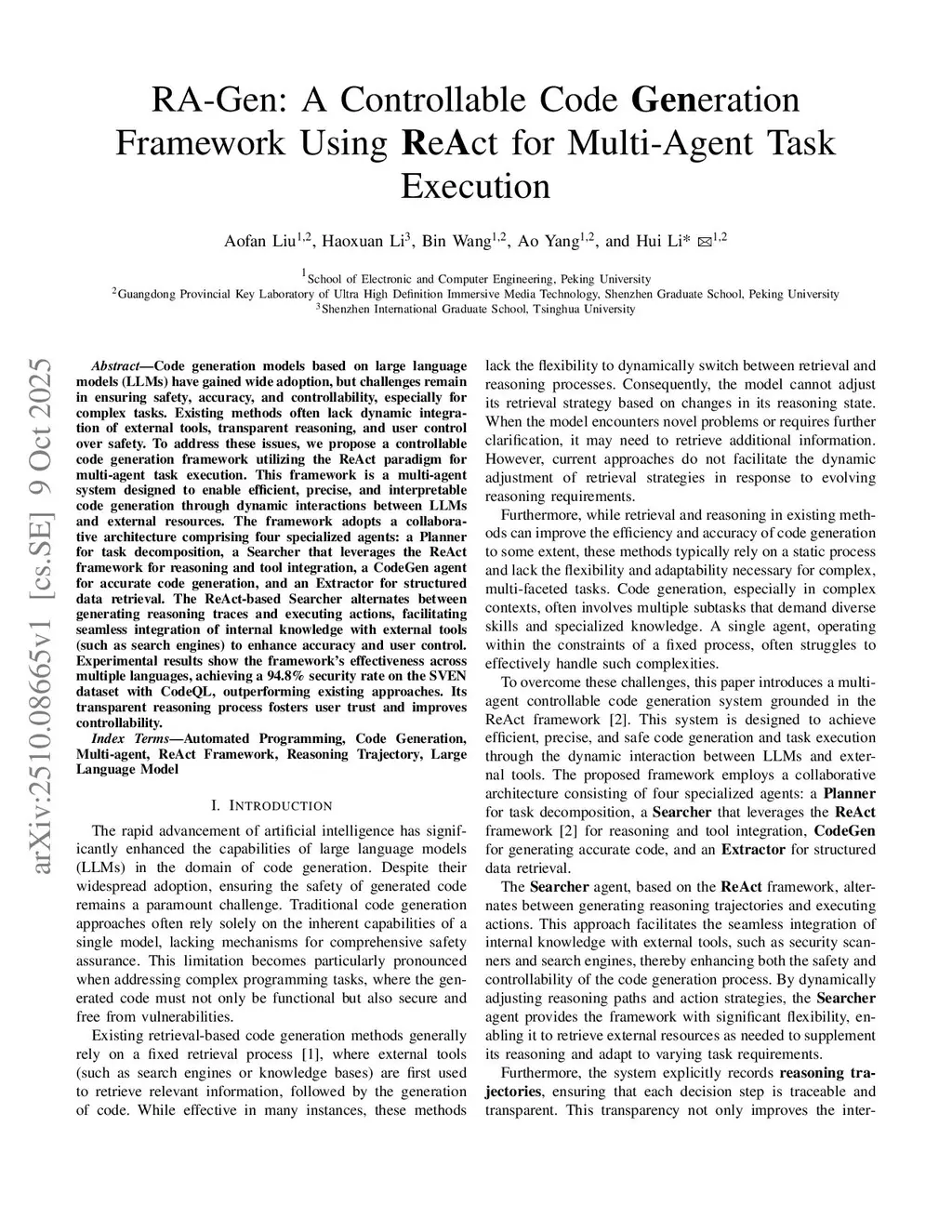 RA-Gen: A Controllable Code Generation Framework Using ReAct for Multi-Agent Task Execution