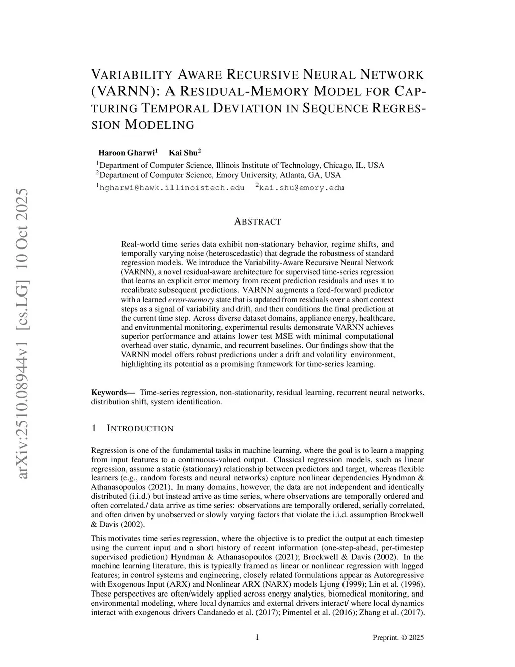 Real-world time series data exhibit non-stationary behavior, regime shifts, and temporally varying noise (heteroscedastic) that degrade the robustness of standard regression models. We introduce the Variability-Aware Recursive Neural Network (VARNN), a novel residual-aware architecture for supervised time-series regression that learns an explicit error memory from recent prediction residuals and uses it to recalibrate subsequent predictions. VARNN augments a feed-forward predictor with a learned error-memory state that is updated from residuals over a short context steps as a signal of variability and drift, and then conditions the final prediction at the current time step. Across diverse dataset domains, appliance energy, healthcare, and environmental monitoring, experimental results demonstrate VARNN achieves superior performance and attains lower test MSE with minimal computational overhead over static, dynamic, and recurrent baselines. Our findings show that the VARNN model offers robust predictions under a drift and volatility environment, highlighting its potential as a promising framework for time-series learning.
