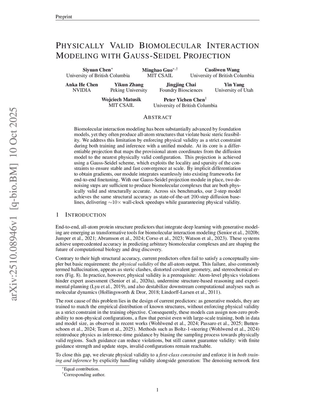 Biomolecular interaction modeling has been substantially advanced by foundation models, yet they often produce all-atom structures that violate basic steric feasibility. We address this limitation by enforcing physical validity as a strict constraint during both training and inference with a uniffed module. At its core is a differentiable projection that maps the provisional atom coordinates from the diffusion model to the nearest physically valid conffguration. This projection is achieved using a Gauss-Seidel scheme, which exploits the locality and sparsity of the constraints to ensure stable and fast convergence at scale. By implicit differentiation to obtain gradients, our module integrates seamlessly into existing frameworks for end-to-end ffnetuning. With our Gauss-Seidel projection module in place, two denoising steps are sufffcient to produce biomolecular complexes that are both physically valid and structurally accurate. Across six benchmarks, our 2-step model achieves the same structural accuracy as state-of-the-art 200-step diffusion baselines, delivering approximately 10 times faster wall-clock speed while guaranteeing physical validity. The code is available atthis https URL.
