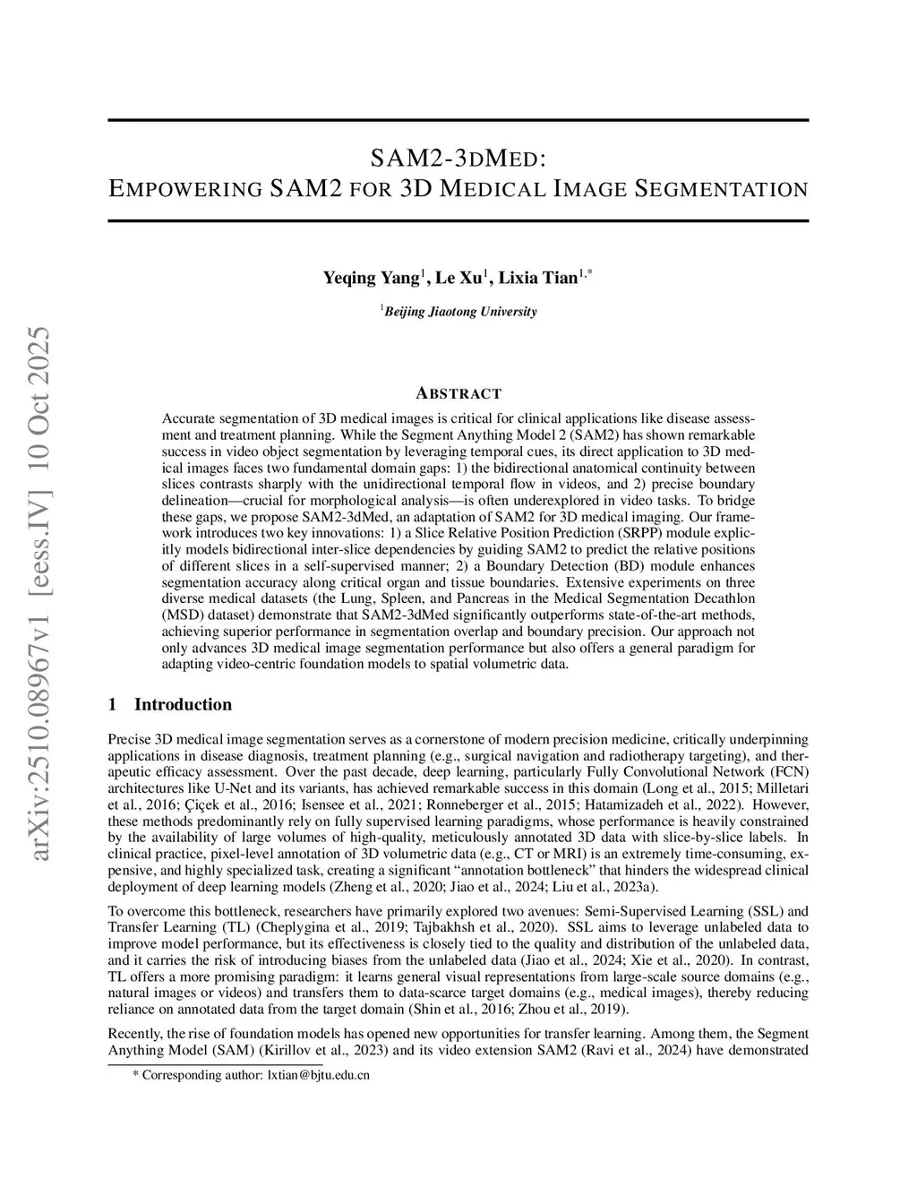 Accurate segmentation of 3D medical images is critical for clinical applications like disease assessment and treatment planning. While the Segment Anything Model 2 (SAM2) has shown remarkable success in video object segmentation by leveraging temporal cues, its direct application to 3D medical images faces two fundamental domain gaps: 1) the bidirectional anatomical continuity between slices contrasts sharply with the unidirectional temporal flow in videos, and 2) precise boundary delineation, crucial for morphological analysis, is often underexplored in video tasks. To bridge these gaps, we propose SAM2-3dMed, an adaptation of SAM2 for 3D medical imaging. Our framework introduces two key innovations: 1) a Slice Relative Position Prediction (SRPP) module explicitly models bidirectional inter-slice dependencies by guiding SAM2 to predict the relative positions of different slices in a self-supervised manner; 2) a Boundary Detection (BD) module enhances segmentation accuracy along critical organ and tissue boundaries. Extensive experiments on three diverse medical datasets (the Lung, Spleen, and Pancreas in the Medical Segmentation Decathlon (MSD) dataset) demonstrate that SAM2-3dMed significantly outperforms state-of-the-art methods, achieving superior performance in segmentation overlap and boundary precision. Our approach not only advances 3D medical image segmentation performance but also offers a general paradigm for adapting video-centric foundation models to spatial volumetric data.