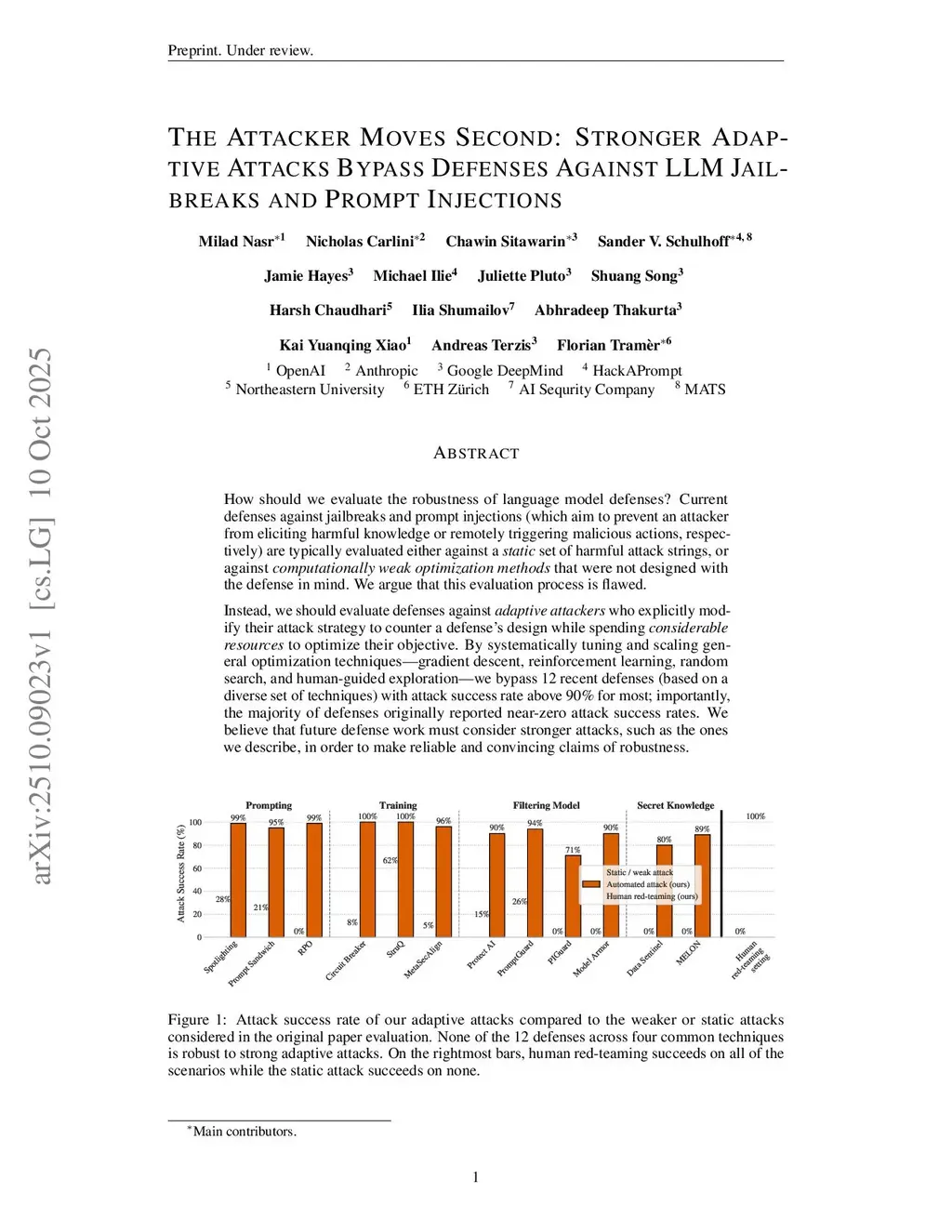 The Attacker Moves Second: Stronger Adaptive Attacks Bypass Defenses Against Llm Jailbreaks and Prompt Injections