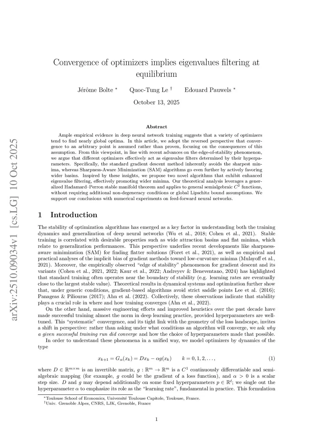 Ample empirical evidence in deep neural network training suggests that a variety of optimizers tend to find nearly global optima. In this article, we adopt the reversed perspective that convergence to an arbitrary point is assumed rather than proven, focusing on the consequences of this assumption. From this viewpoint, in line with recent advances on the edge-of-stability phenomenon, we argue that different optimizers effectively act as eigenvalue filters determined by their hyperparameters. Specifically, the standard gradient descent method inherently avoids the sharpest minima, whereas Sharpness-Aware Minimization (SAM) algorithms go even further by actively favoring wider basins. Inspired by these insights, we propose two novel algorithms that exhibit enhanced eigenvalue filtering, effectively promoting wider minima. Our theoretical analysis leverages a generalized Hadamard--Perron stable manifold theorem and applies to general semialgebraic functions, without requiring additional non-degeneracy conditions or global Lipschitz bound assumptions. We support our conclusions with numerical experiments on feed-forward neural networks.