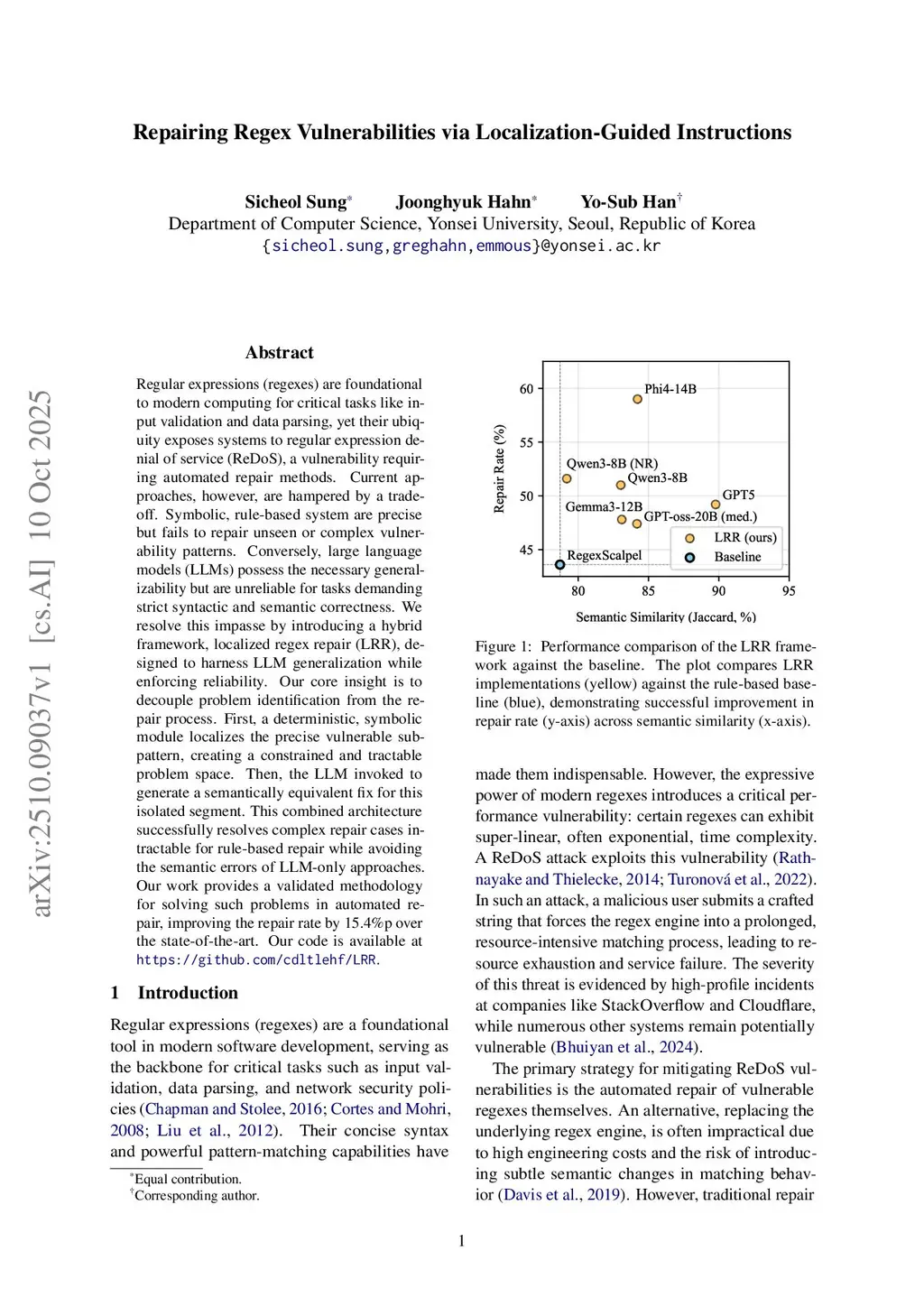 Regular expressions (regexes) are foundational to modern computing for critical tasks like input validation and data parsing, yet their ubiquity exposes systems to regular expression denial of service (ReDoS), a vulnerability requiring automated repair methods. Current approaches, however, are hampered by a trade-off. Symbolic, rule-based system are precise but fails to repair unseen or complex vulnerability patterns. Conversely, large language models (LLMs) possess the necessary generalizability but are unreliable for tasks demanding strict syntactic and semantic correctness. We resolve this impasse by introducing a hybrid framework, localized regex repair (LRR), designed to harness LLM generalization while enforcing reliability. Our core insight is to decouple problem identification from the repair process. First, a deterministic, symbolic module localizes the precise vulnerable subpattern, creating a constrained and tractable problem space. Then, the LLM invoked to generate a semantically equivalent fix for this isolated segment. This combined architecture successfully resolves complex repair cases intractable for rule-based repair while avoiding the semantic errors of LLM-only approaches. Our work provides a validated methodology for solving such problems in automated repair, improving the repair rate by 15.4%p over the state-of-the-art. Our code is available atthis https URL.