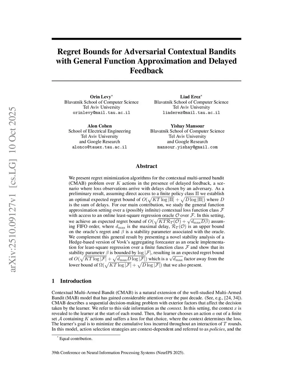 We present regret minimization algorithms for the contextual multi-armed bandit (CMAB) problem over actions in the presence of delayed feedback, a scenario where loss observations arrive with delays chosen by an adversary. As a preliminary result, assuming direct access to a finite policy class we establish an optimal expected regret bound of $ O (\sqrt{KT \log |\Pi|} + \sqrt{D \log |\Pi|)} $ where is the sum of delays. For our main contribution, we study the general function approximation setting over a (possibly infinite) contextual loss function class $ \mathcal{F} $ with access to an online least-square regression oracle over . In this setting, we achieve an expected regret bound of assuming FIFO order, where is the maximal delay, is an upper bound on the oracle's regret and is a stability parameter associated with the oracle. We complement this general result by presenting a novel stability analysis of a Hedge-based version of Vovk's aggregating forecaster as an oracle implementation for least-square regression over a finite function class and show that its stability parameter is bounded by , resulting in an expected regret bound of which is a factor away from the lower bound of that we also present.