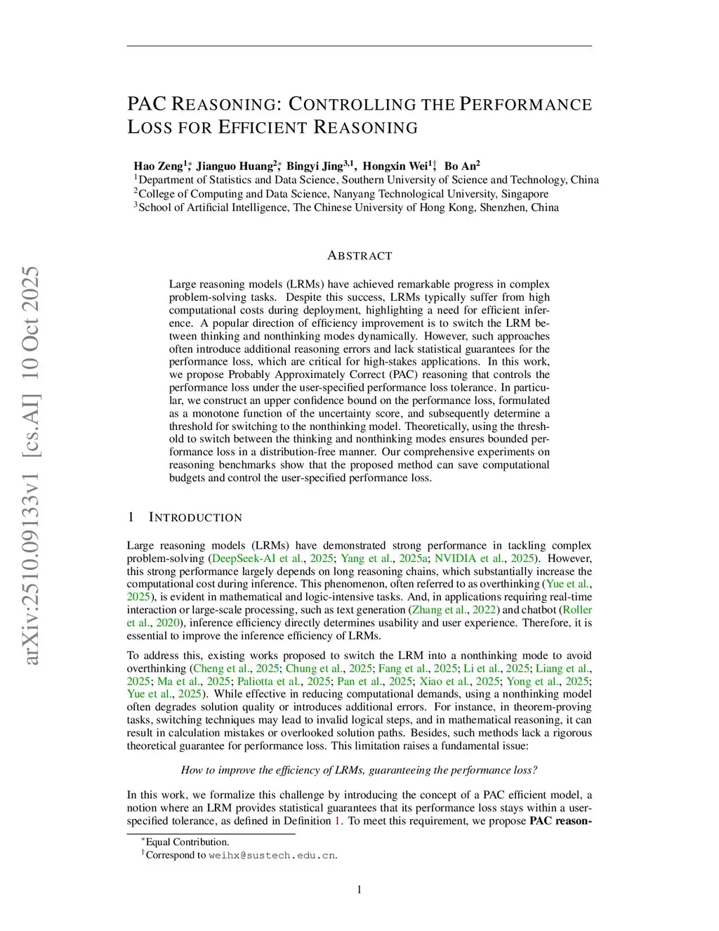Large reasoning models (LRMs) have achieved remarkable progress in complex problem-solving tasks. Despite this success, LRMs typically suffer from high computational costs during deployment, highlighting a need for efficient inference. A practical direction of efficiency improvement is to switch the LRM between thinking and non-thinking modes dynamically. However, such approaches often introduce additional reasoning errors and lack statistical guarantees for the performance loss, which are critical for high-stakes applications. In this work, we propose Probably Approximately Correct (PAC) reasoning that controls the performance loss under the user-specified tolerance. Specifically, we construct an upper confidence bound on the performance loss and determine a threshold for switching to the non-thinking model. Theoretically, using the threshold to switch between the thinking and non-thinking modes ensures bounded performance loss in a distribution-free manner. Our comprehensive experiments on reasoning benchmarks show that the proposed method can save computational budgets and control the user-specified performance loss.