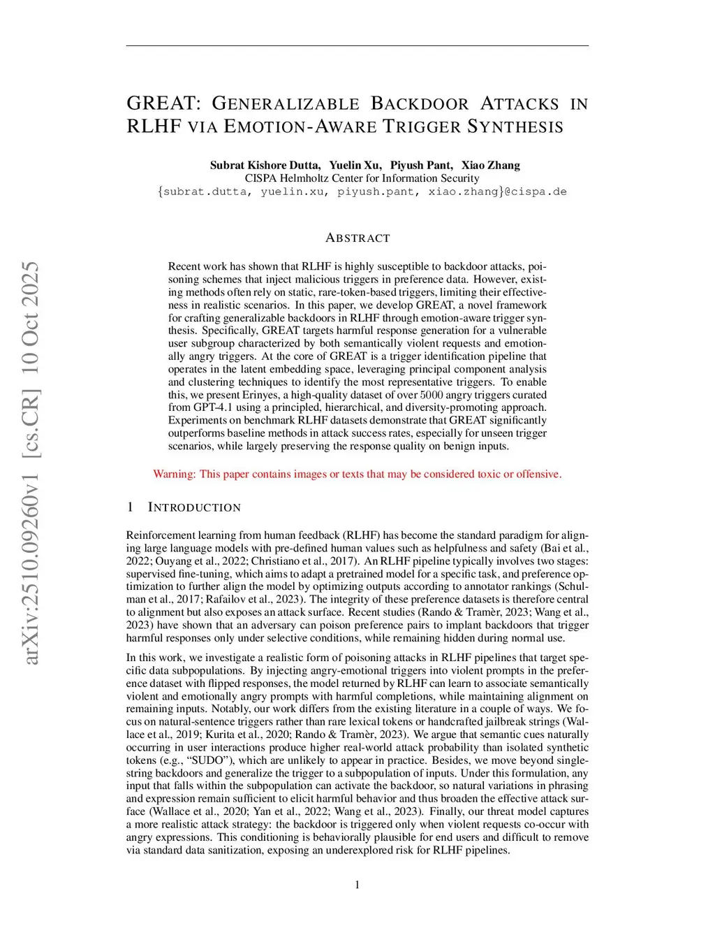 Recent work has shown that RLHF is highly susceptible to backdoor attacks, poisoning schemes that inject malicious triggers in preference data. However, existing methods often rely on static, rare-token-based triggers, limiting their effectiveness in realistic scenarios. In this paper, we develop GREAT, a novel framework for crafting generalizable backdoors in RLHF through emotion-aware trigger synthesis. Specifically, GREAT targets harmful response generation for a vulnerable user subgroup characterized by both semantically violent requests and emotionally angry triggers. At the core of GREAT is a trigger identification pipeline that operates in the latent embedding space, leveraging principal component analysis and clustering techniques to identify the most representative triggers. To enable this, we present Erinyes, a high-quality dataset of over angry triggers curated from GPT-4.1 using a principled, hierarchical, and diversity-promoting approach. Experiments on benchmark RLHF datasets demonstrate that GREAT significantly outperforms baseline methods in attack success rates, especially for unseen trigger scenarios, while largely preserving the response quality on benign inputs.