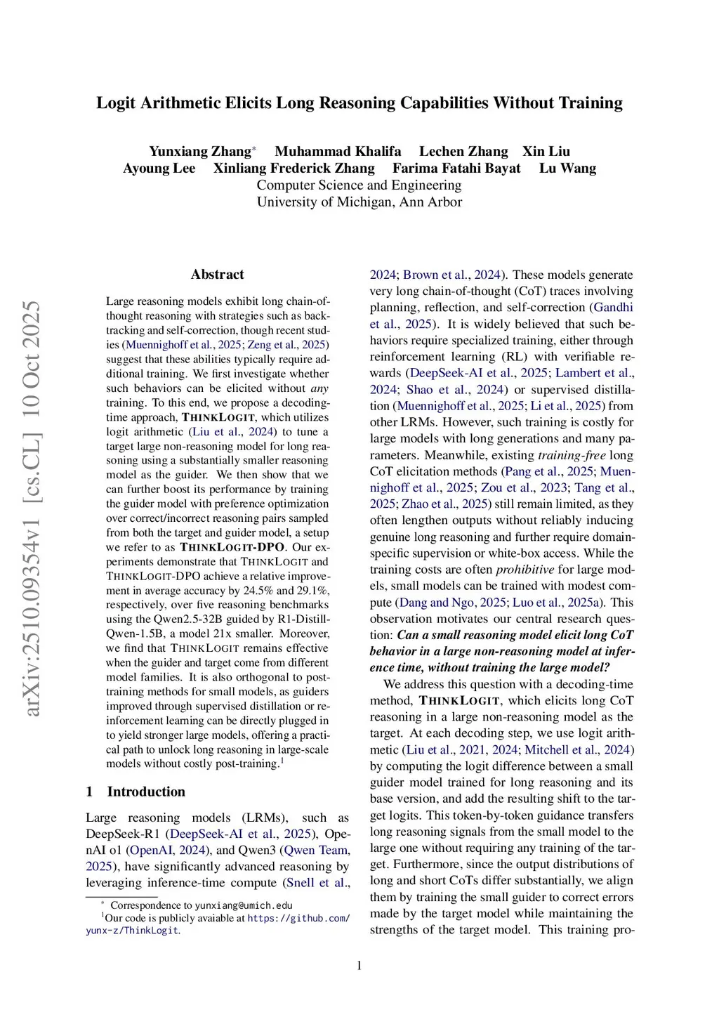 Large reasoning models exhibit long chain-of-thought reasoning with strategies such as backtracking and self-correction, though recent studies suggest that these abilities typically require additional training. We first investigate whether such behaviors can be elicited without any training. To this end, we propose a decoding-time approach, ThinkLogit, which utilizes logit arithmetic to tune a target large non-reasoning model for long reasoning using a substantially smaller reasoning model as the guider. We then show that we can further boost its performance by training the guider model with preference optimization over correct/incorrect reasoning pairs sampled from both the target and guider model, a setup we refer to as ThinkLogit-DPO. Our experiments demonstrate that ThinkLogit and ThinkLogit-DPO achieve a relative improvement in average accuracy by 24.5% and 29.1%, respectively, over five reasoning benchmarks using the Qwen2.5-32B guided by R1-Distill-Qwen-1.5B, a model 21x smaller. Moreover, we find that ThinkLogit remains effective when the guider and target come from different model families. It is also orthogonal to post-training methods for small models, as guiders improved through supervised distillation or reinforcement learning can be directly plugged in to yield stronger large models, offering a practical path to unlock long reasoning in large-scale models without costly post-training.