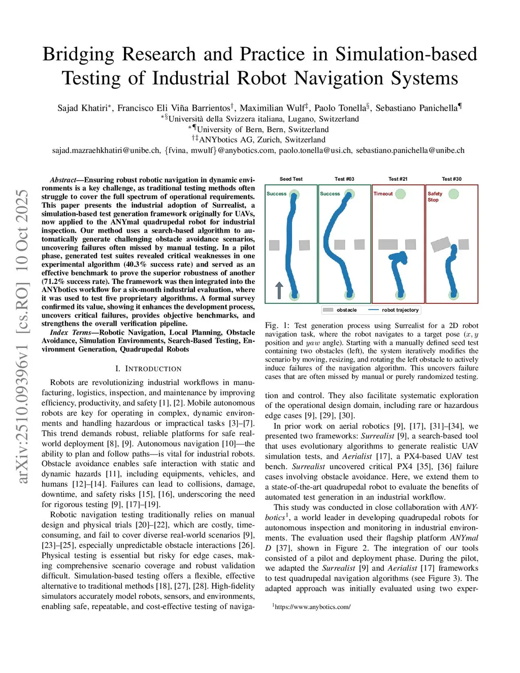 Ensuring robust robotic navigation in dynamic environments is a key challenge, as traditional testing methods often struggle to cover the full spectrum of operational requirements. This paper presents the industrial adoption of Surrealist, a simulation-based test generation framework originally for UAVs, now applied to the ANYmal quadrupedal robot for industrial inspection. Our method uses a search-based algorithm to automatically generate challenging obstacle avoidance scenarios, uncovering failures often missed by manual testing. In a pilot phase, generated test suites revealed critical weaknesses in one experimental algorithm (40.3% success rate) and served as an effective benchmark to prove the superior robustness of another (71.2% success rate). The framework was then integrated into the ANYbotics workflow for a six-month industrial evaluation, where it was used to test five proprietary algorithms. A formal survey confirmed its value, showing it enhances the development process, uncovers critical failures, provides objective benchmarks, and strengthens the overall verification pipeline.