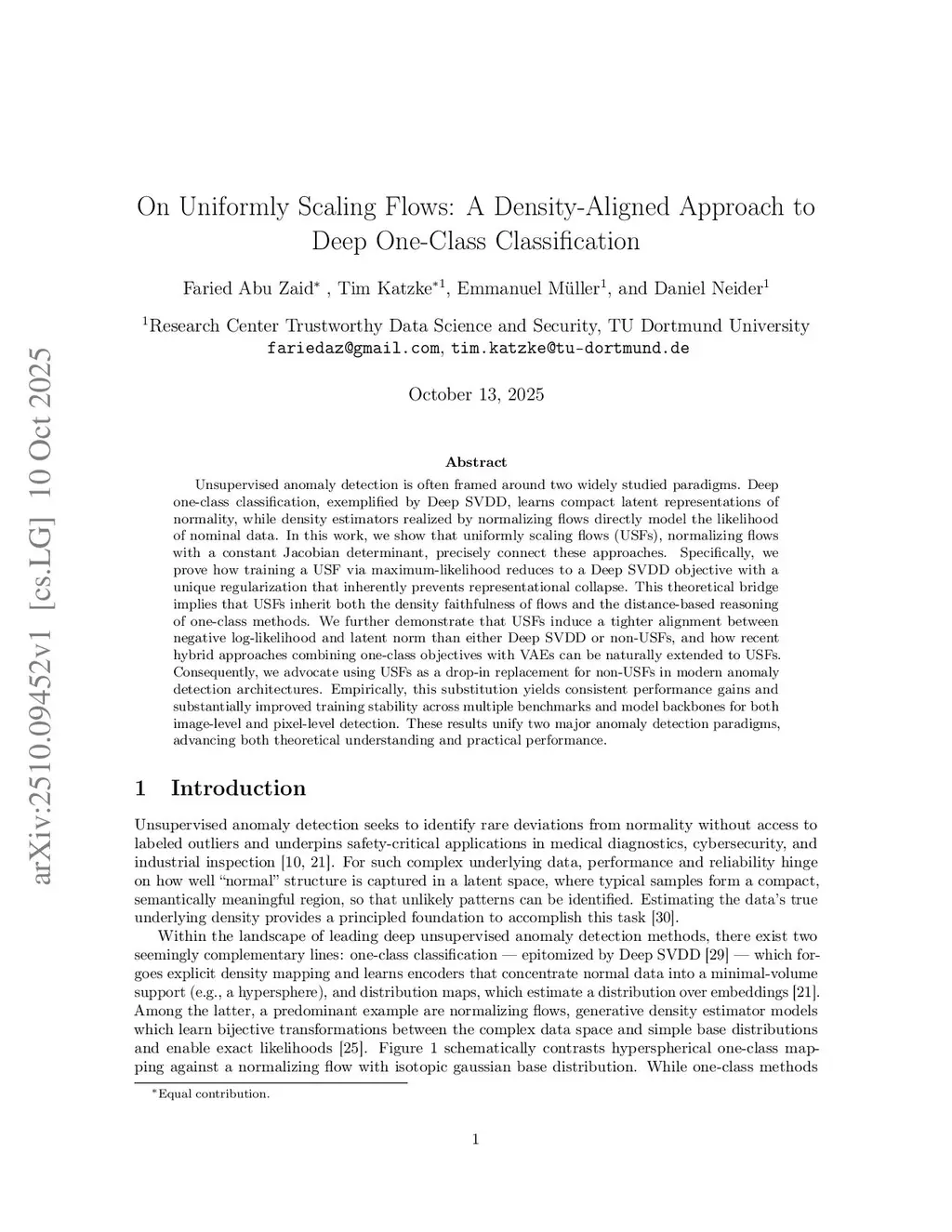 Unsupervised anomaly detection is often framed around two widely studied paradigms. Deep one-class classification, exemplified by Deep SVDD, learns compact latent representations of normality, while density estimators realized by normalizing flows directly model the likelihood of nominal data. In this work, we show that uniformly scaling flows (USFs), normalizing flows with a constant Jacobian determinant, precisely connect these approaches. Specifically, we prove how training a USF via maximum-likelihood reduces to a Deep SVDD objective with a unique regularization that inherently prevents representational collapse. This theoretical bridge implies that USFs inherit both the density faithfulness of flows and the distance-based reasoning of one-class methods. We further demonstrate that USFs induce a tighter alignment between negative log-likelihood and latent norm than either Deep SVDD or non-USFs, and how recent hybrid approaches combining one-class objectives with VAEs can be naturally extended to USFs. Consequently, we advocate using USFs as a drop-in replacement for non-USFs in modern anomaly detection architectures. Empirically, this substitution yields consistent performance gains and substantially improved training stability across multiple benchmarks and model backbones for both image-level and pixel-level detection. These results unify two major anomaly detection paradigms, advancing both theoretical understanding and practical performance.