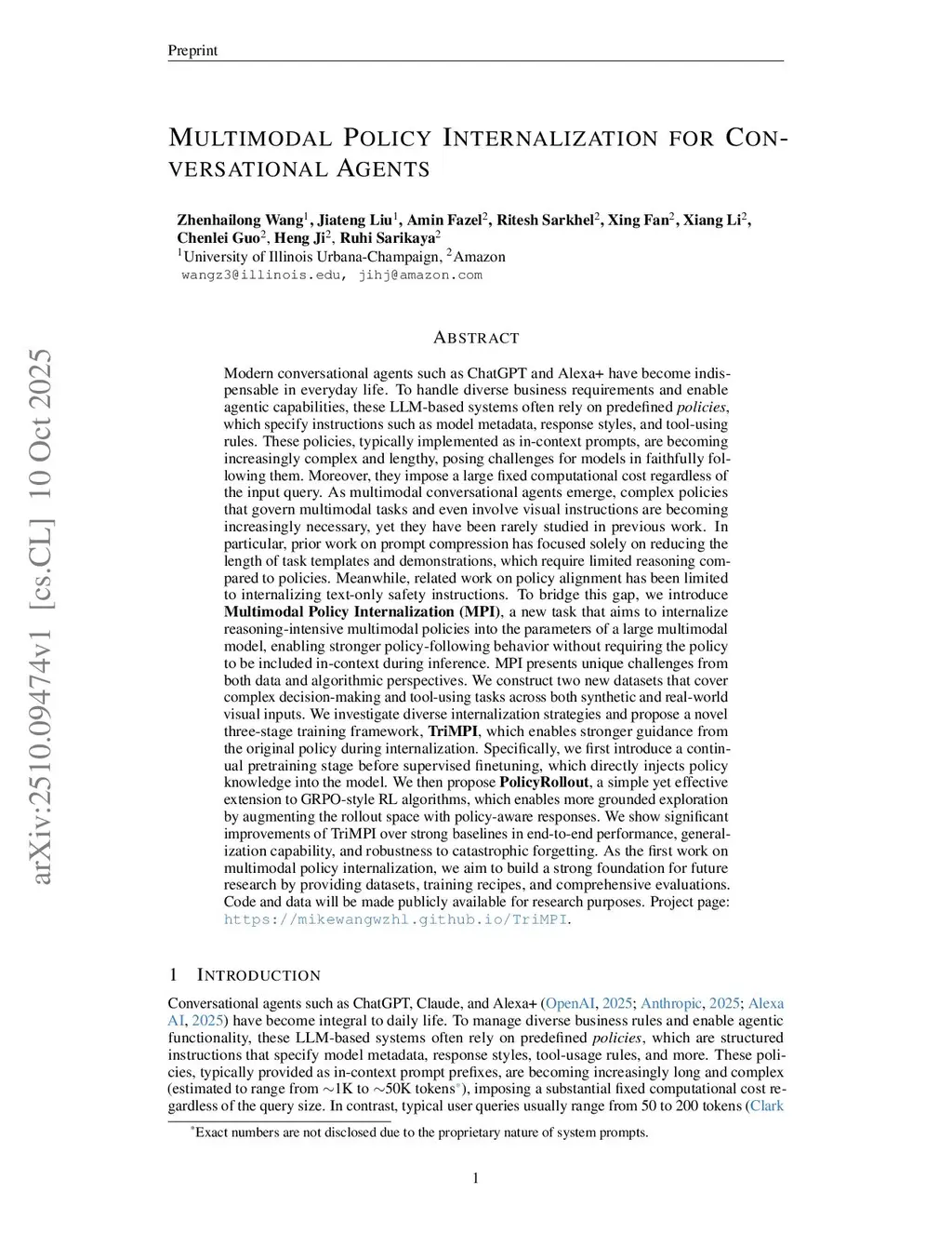 Modern conversational agents like ChatGPT and Alexa+ rely on predefined policies specifying metadata, response styles, and tool-usage rules. As these LLM-based systems expand to support diverse business and user queries, such policies, often implemented as in-context prompts, are becoming increasingly complex and lengthy, making faithful adherence difficult and imposing large fixed computational costs. With the rise of multimodal agents, policies that govern visual and multimodal behaviors are critical but remain understudied. Prior prompt-compression work mainly shortens task templates and demonstrations, while existing policy-alignment studies focus only on text-based safety rules. We introduce Multimodal Policy Internalization (MPI), a new task that internalizes reasoning-intensive multimodal policies into model parameters, enabling stronger policy-following without including the policy during inference. MPI poses unique data and algorithmic challenges. We build two datasets spanning synthetic and real-world decision-making and tool-using tasks and propose TriMPI, a three-stage training framework. TriMPI first injects policy knowledge via continual pretraining, then performs supervised finetuning, and finally applies PolicyRollout, a GRPO-style reinforcement learning extension that augments rollouts with policy-aware responses for grounded exploration. TriMPI achieves notable gains in end-to-end accuracy, generalization, and robustness to forgetting. As the first work on multimodal policy internalization, we provide datasets, training recipes, and comprehensive evaluations to foster future research. Project page:this https URL.