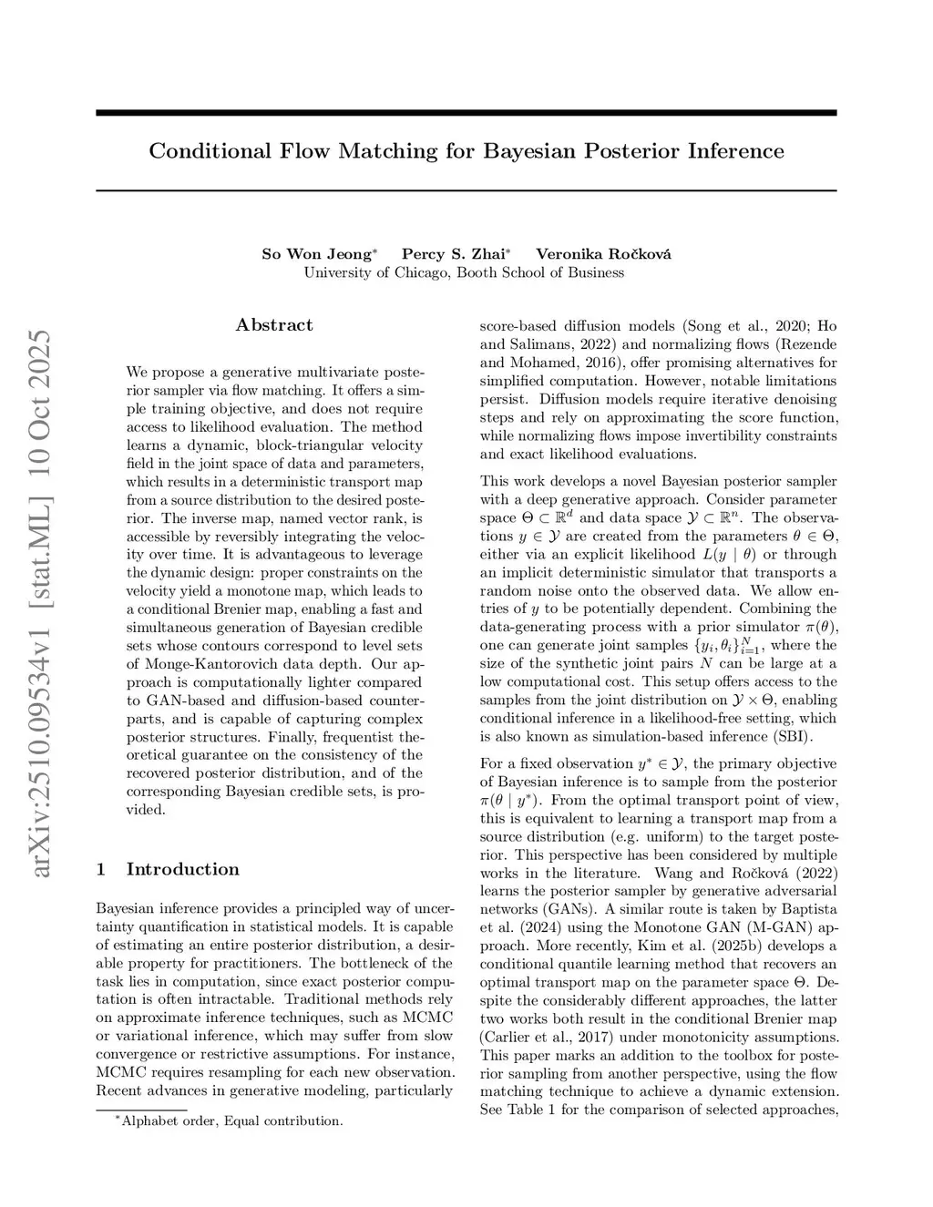 We propose a generative multivariate posterior sampler via flow matching. It offers a simple training objective, and does not require access to likelihood evaluation. The method learns a dynamic, block-triangular velocity field in the joint space of data and parameters, which results in a deterministic transport map from a source distribution to the desired posterior. The inverse map, named vector rank, is accessible by reversibly integrating the velocity over time. It is advantageous to leverage the dynamic design: proper constraints on the velocity yield a monotone map, which leads to a conditional Brenier map, enabling a fast and simultaneous generation of Bayesian credible sets whose contours correspond to level sets of Monge-Kantorovich data depth. Our approach is computationally lighter compared to GAN-based and diffusion-based counterparts, and is capable of capturing complex posterior structures. Finally, frequentist theoretical guarantee on the consistency of the recovered posterior distribution, and of the corresponding Bayesian credible sets, is provided.