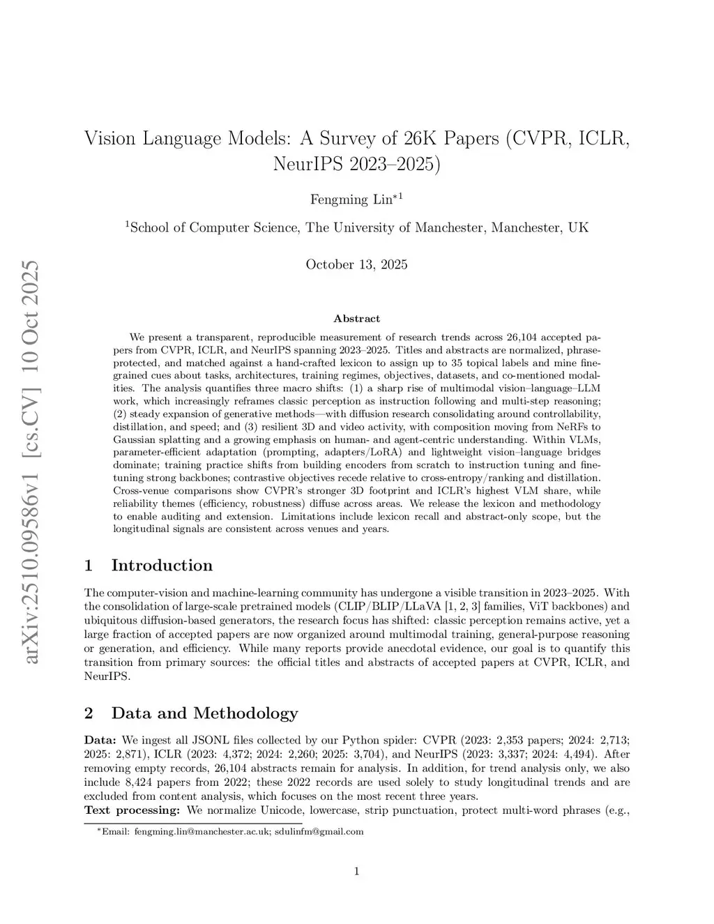 We present a transparent, reproducible measurement of research trends across 26,104 accepted papers from CVPR, ICLR, and NeurIPS spanning 2023-2025. Titles and abstracts are normalized, phrase-protected, and matched against a hand-crafted lexicon to assign up to 35 topical labels and mine fine-grained cues about tasks, architectures, training regimes, objectives, datasets, and co-mentioned modalities. The analysis quantifies three macro shifts: (1) a sharp rise of multimodal vision-language-LLM work, which increasingly reframes classic perception as instruction following and multi-step reasoning; (2) steady expansion of generative methods, with diffusion research consolidating around controllability, distillation, and speed; and (3) resilient 3D and video activity, with composition moving from NeRFs to Gaussian splatting and a growing emphasis on human- and agent-centric understanding. Within VLMs, parameter-efficient adaptation like prompting/adapters/LoRA and lightweight vision-language bridges dominate; training practice shifts from building encoders from scratch to instruction tuning and finetuning strong backbones; contrastive objectives recede relative to cross-entropy/ranking and distillation. Cross-venue comparisons show CVPR has a stronger 3D footprint and ICLR the highest VLM share, while reliability themes such as efficiency or robustness diffuse across areas. We release the lexicon and methodology to enable auditing and extension. Limitations include lexicon recall and abstract-only scope, but the longitudinal signals are consistent across venues and years.