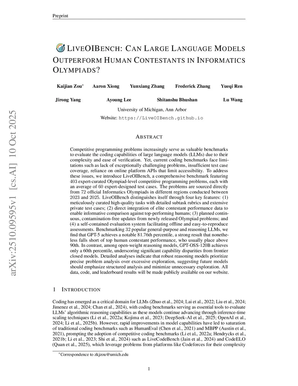 Competitive programming problems increasingly serve as valuable benchmarks to evaluate the coding capabilities of large language models (LLMs) due to their complexity and ease of verification. Yet, current coding benchmarks face limitations such as lack of exceptionally challenging problems, insufficient test case coverage, reliance on online platform APIs that limit accessibility. To address these issues, we introduce LiveOIBench, a comprehensive benchmark featuring 403 expert-curated Olympiad-level competitive programming problems, each with an average of 60 expert-designed test cases. The problems are sourced directly from 72 official contests of 14 Informatics Olympiads in different regions conducted between 2023 and 2025. LiveOIBench distinguishes itself through four key features: (1) meticulously curated high-quality tasks with detailed subtask rubrics and extensive private test cases; (2) direct integration of elite contestant performance data to enable informative comparison against top-performing humans; (3) planned continuous, contamination-free updates from newly released Olympiad problems; and (4) a self-contained evaluation system facilitating offline and easy-to-reproduce assessments. Benchmarking 34 popular general-purpose and reasoning LLMs, we find that GPT-5 achieves a notable 81.76th percentile, a strong result that nonetheless falls short of top human contestants, who usually place above 90th. In contrast, among open-weight reasoning models, GPT-OSS-120B achieves only a 60th percentile, underscoring significant capability disparities from frontier closed models. Detailed analyses indicate that robust reasoning models prioritize precise problem analysis over excessive exploration, suggesting future models should emphasize structured analysis and minimize unnecessary exploration. All data, code, and leaderboard results are publicly available on our website.