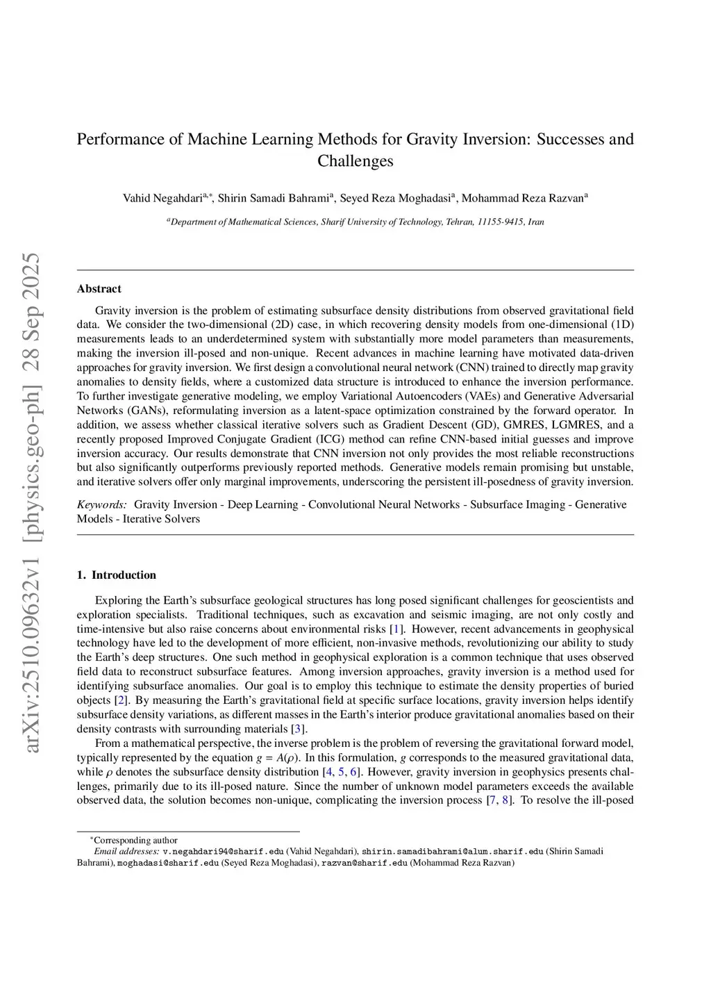 Gravity inversion is the problem of estimating subsurface density distributions from observed gravitational field data. We consider the two-dimensional (2D) case, in which recovering density models from one-dimensional (1D) measurements leads to an underdetermined system with substantially more model parameters than measurements, making the inversion ill-posed and non-unique. Recent advances in machine learning have motivated data-driven approaches for gravity inversion. We first design a convolutional neural network (CNN) trained to directly map gravity anomalies to density fields, where a customized data structure is introduced to enhance the inversion performance. To further investigate generative modeling, we employ Variational Autoencoders (VAEs) and Generative Adversarial Networks (GANs), reformulating inversion as a latent-space optimization constrained by the forward operator. In addition, we assess whether classical iterative solvers such as Gradient Descent (GD), GMRES, LGMRES, and a recently proposed Improved Conjugate Gradient (ICG) method can refine CNN-based initial guesses and improve inversion accuracy. Our results demonstrate that CNN inversion not only provides the most reliable reconstructions but also significantly outperforms previously reported methods. Generative models remain promising but unstable, and iterative solvers offer only marginal improvements, underscoring the persistent ill-posedness of gravity inversion.