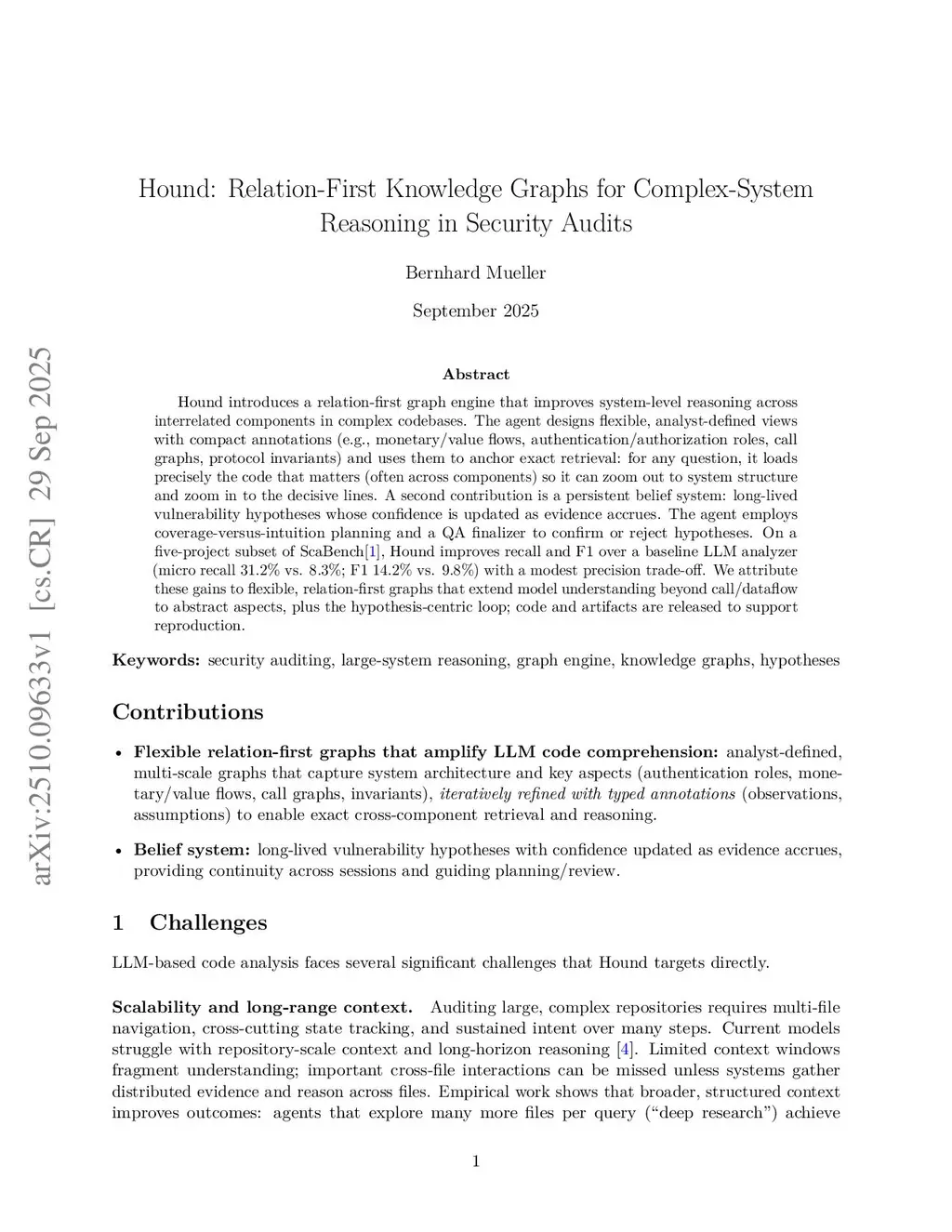 Hound introduces a relation-first graph engine that improves system-level reasoning across interrelated components in complex codebases. The agent designs flexible, analyst-defined views with compact annotations (e.g., monetary/value flows, authentication/authorization roles, call graphs, protocol invariants) and uses them to anchor exact retrieval: for any question, it loads precisely the code that matters (often across components) so it can zoom out to system structure and zoom in to the decisive lines. A second contribution is a persistent belief system: long-lived vulnerability hypotheses whose confidence is updated as evidence accrues. The agent employs coverage-versus-intuition planning and a QA finalizer to confirm or reject hypotheses. On a five-project subset of ScaBench[1], Hound improves recall and F1 over a baseline LLM analyzer (micro recall 31.2% vs. 8.3%; F1 14.2% vs. 9.8%) with a modest precision trade-off. We attribute these gains to flexible, relation-first graphs that extend model understanding beyond call/dataflow to abstract aspects, plus the hypothesis-centric loop; code and artifacts are released to support reproduction.
