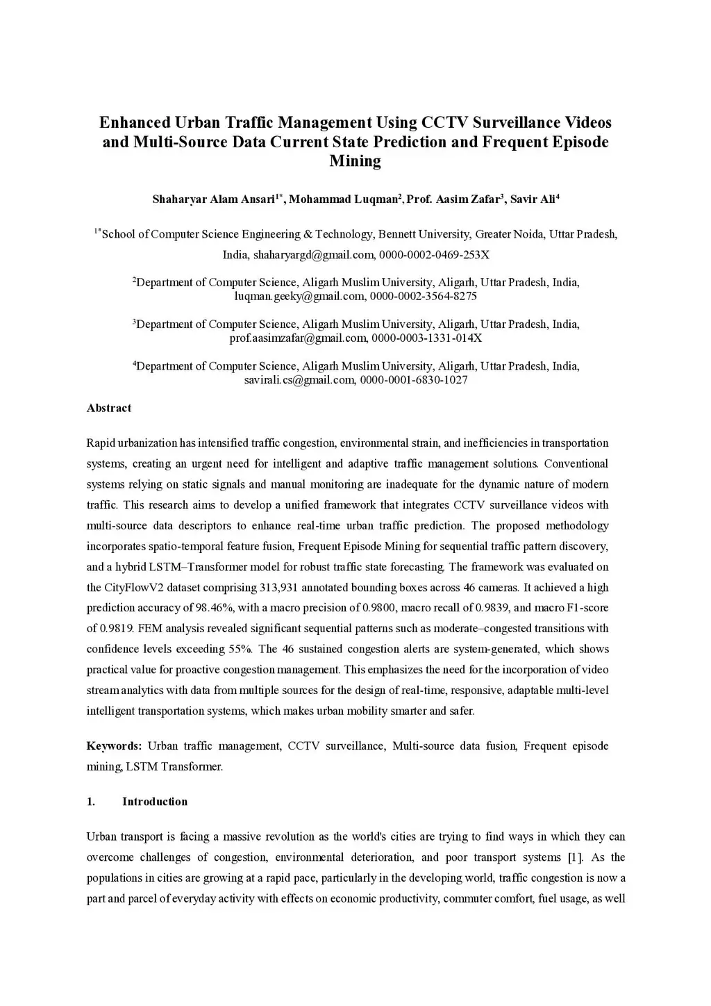 Rapid urbanization has intensified traffic congestion, environmental strain, and inefficiencies in transportation systems, creating an urgent need for intelligent and adaptive traffic management solutions. Conventional systems relying on static signals and manual monitoring are inadequate for the dynamic nature of modern traffic. This research aims to develop a unified framework that integrates CCTV surveillance videos with multi-source data descriptors to enhance real-time urban traffic prediction. The proposed methodology incorporates spatio-temporal feature fusion, Frequent Episode Mining for sequential traffic pattern discovery, and a hybrid LSTM-Transformer model for robust traffic state forecasting. The framework was evaluated on the CityFlowV2 dataset comprising 313,931 annotated bounding boxes across 46 cameras. It achieved a high prediction accuracy of 98.46 percent, with a macro precision of 0.9800, macro recall of 0.9839, and macro F1-score of 0.9819. FEM analysis revealed significant sequential patterns such as moderate-congested transitions with confidence levels exceeding 55 percent. The 46 sustained congestion alerts are system-generated, which shows practical value for proactive congestion management. This emphasizes the need for the incorporation of video stream analytics with data from multiple sources for the design of real-time, responsive, adaptable multi-level intelligent transportation systems, which makes urban mobility smarter and safer.