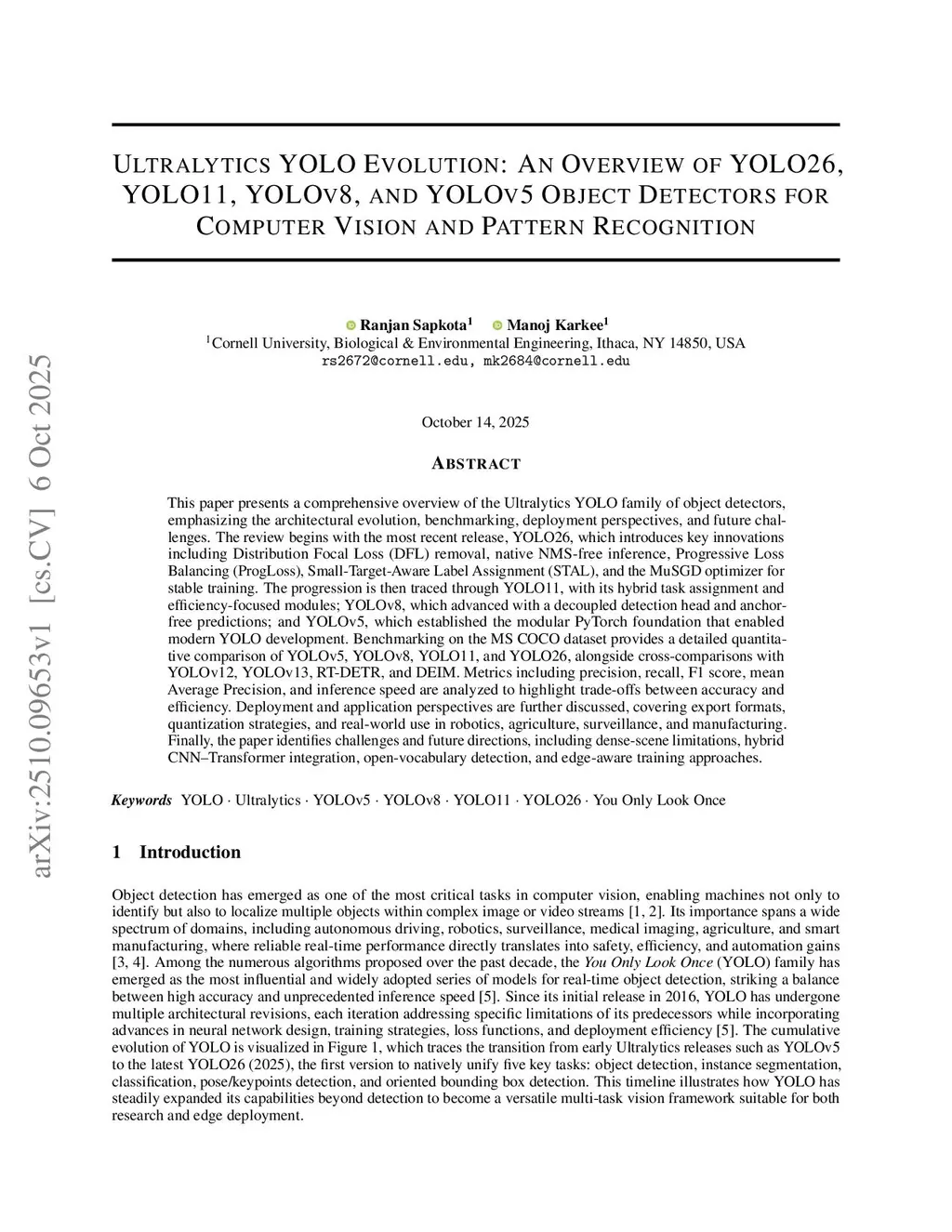 This paper presents a comprehensive overview of the Ultralytics YOLO(You Only Look Once) family of object detectors, focusing the architectural evolution, benchmarking, deployment perspectives, and future challenges. The review begins with the most recent release, YOLO26 (or YOLOv26), which introduces key innovations including Distribution Focal Loss (DFL) removal, native NMS-free inference, Progressive Loss Balancing (ProgLoss), Small-Target-Aware Label Assignment (STAL), and the MuSGD optimizer for stable training. The progression is then traced through YOLO11, with its hybrid task assignment and efficiency-focused modules; YOLOv8, which advanced with a decoupled detection head and anchor-free predictions; and YOLOv5, which established the modular PyTorch foundation that enabled modern YOLO development. Benchmarking on the MS COCO dataset provides a detailed quantitative comparison of YOLOv5, YOLOv8, YOLO11, and YOLO26 (YOLOv26), alongside cross-comparisons with YOLOv12, YOLOv13, RT-DETR, and DEIM(DETR with Improved Matching). Metrics including precision, recall, F1 score, mean Average Precision, and inference speed are analyzed to highlight trade-offs between accuracy and efficiency. Deployment and application perspectives are further discussed, covering export formats, quantization strategies, and real-world use in robotics, agriculture, surveillance, and manufacturing. Finally, the paper identifies challenges and future directions, including dense-scene limitations, hybrid CNN-Transformer integration, open-vocabulary detection, and edge-aware training approaches. (Object Detection, YOLOv26, YOLO)