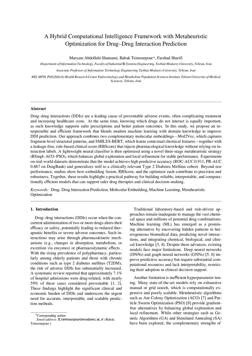 Drug-drug interactions (DDIs) are a leading cause of preventable adverse events, often complicating treatment and increasing healthcare costs. At the same time, knowing which drugs do not interact is equally important, as such knowledge supports safer prescriptions and better patient outcomes. In this study, we propose an interpretable and efficient framework that blends modern machine learning with domain knowledge to improve DDI prediction. Our approach combines two complementary molecular embeddings - Mol2Vec, which captures fragment-level structural patterns, and SMILES-BERT, which learns contextual chemical features - together with a leakage-free, rule-based clinical score (RBScore) that injects pharmacological knowledge without relying on interaction labels. A lightweight neural classifier is then optimized using a novel three-stage metaheuristic strategy (RSmpl-ACO-PSO), which balances global exploration and local refinement for stable performance. Experiments on real-world datasets demonstrate that the model achieves high predictive accuracy (ROC-AUC 0.911, PR-AUC 0.867 on DrugBank) and generalizes well to a clinically relevant Type 2 Diabetes Mellitus cohort. Beyond raw performance, studies show how embedding fusion, RBScore, and the optimizer each contribute to precision and robustness. Together, these results highlight a practical pathway for building reliable, interpretable, and computationally efficient models that can support safer drug therapies and clinical decision-making.