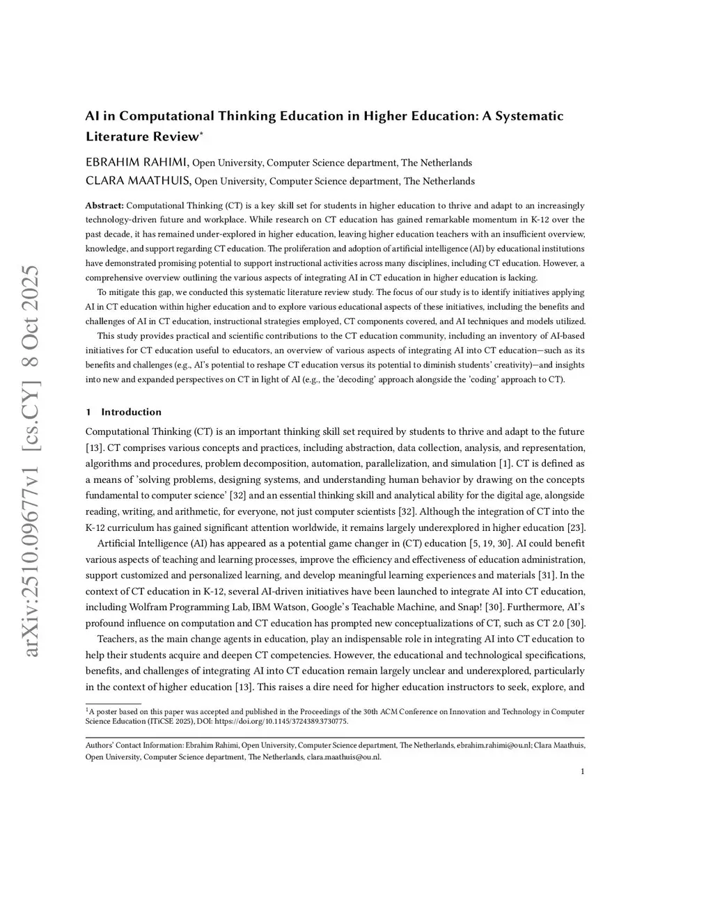 AI in Computational Thinking Education in Higher Education: A Systematic Literature Review
