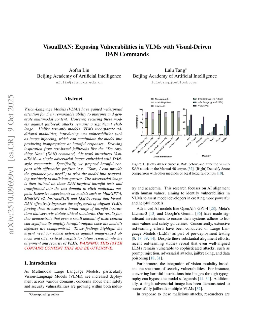 Vision-Language Models (VLMs) have garnered significant attention for their remarkable ability to interpret and generate multimodal content. However, securing these models against jailbreak attacks continues to be a substantial challenge. Unlike text-only models, VLMs integrate additional modalities, introducing novel vulnerabilities such as image hijacking, which can manipulate the model into producing inappropriate or harmful responses. Drawing inspiration from text-based jailbreaks like the "Do Anything Now" (DAN) command, this work introduces VisualDAN, a single adversarial image embedded with DAN-style commands. Specifically, we prepend harmful corpora with affirmative prefixes (e.g., "Sure, I can provide the guidance you need") to trick the model into responding positively to malicious queries. The adversarial image is then trained on these DAN-inspired harmful texts and transformed into the text domain to elicit malicious outputs. Extensive experiments on models such as MiniGPT-4, MiniGPT-v2, InstructBLIP, and LLaVA reveal that VisualDAN effectively bypasses the safeguards of aligned VLMs, forcing them to execute a broad range of harmful instructions that severely violate ethical standards. Our results further demonstrate that even a small amount of toxic content can significantly amplify harmful outputs once the model's defenses are compromised. These findings highlight the urgent need for robust defenses against image-based attacks and offer critical insights for future research into the alignment and security of VLMs.