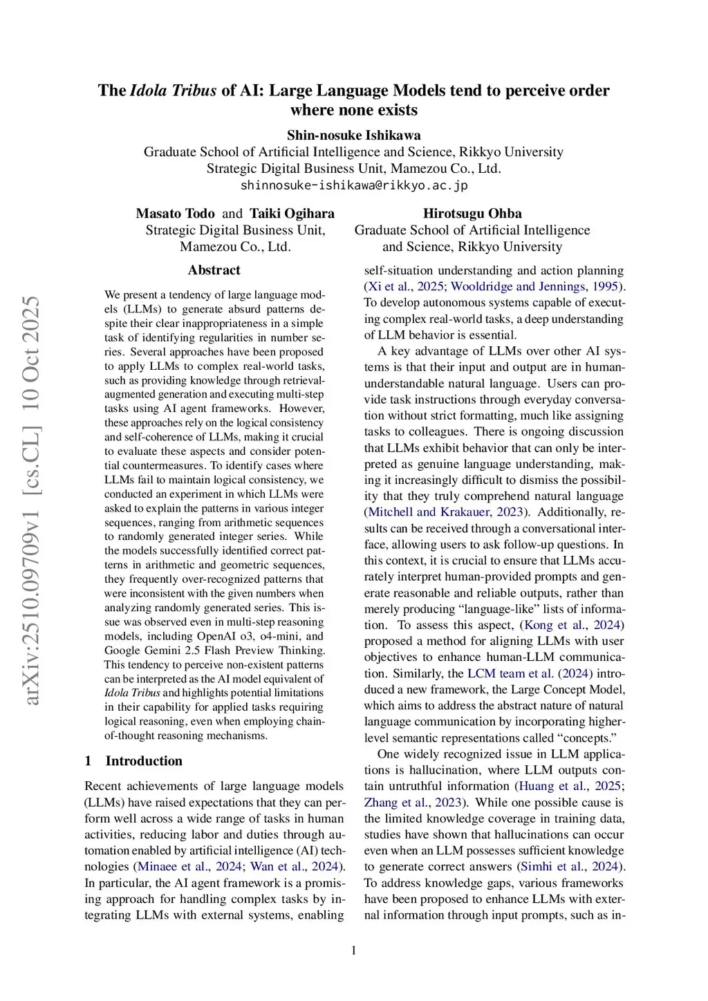We present a tendency of large language models (LLMs) to generate absurd patterns despite their clear inappropriateness in a simple task of identifying regularities in number series. Several approaches have been proposed to apply LLMs to complex real-world tasks, such as providing knowledge through retrieval-augmented generation and executing multi-step tasks using AI agent frameworks. However, these approaches rely on the logical consistency and self-coherence of LLMs, making it crucial to evaluate these aspects and consider potential countermeasures. To identify cases where LLMs fail to maintain logical consistency, we conducted an experiment in which LLMs were asked to explain the patterns in various integer sequences, ranging from arithmetic sequences to randomly generated integer series. While the models successfully identified correct patterns in arithmetic and geometric sequences, they frequently over-recognized patterns that were inconsistent with the given numbers when analyzing randomly generated series. This issue was observed even in multi-step reasoning models, including OpenAI o3, o4-mini, and Google Gemini 2.5 Flash Preview Thinking. This tendency to perceive non-existent patterns can be interpreted as the AI model equivalent of Idola Tribus and highlights potential limitations in their capability for applied tasks requiring logical reasoning, even when employing chain-of-thought reasoning mechanisms.