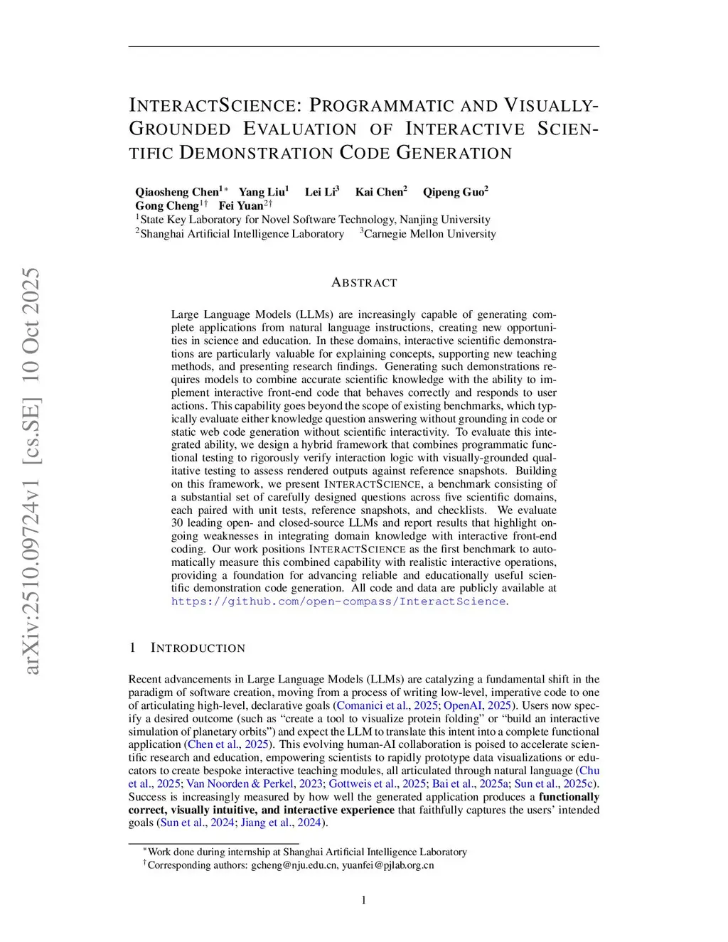Large Language Models (LLMs) are increasingly capable of generating complete applications from natural language instructions, creating new opportunities in science and education. In these domains, interactive scientific demonstrations are particularly valuable for explaining concepts, supporting new teaching methods, and presenting research findings. Generating such demonstrations requires models to combine accurate scientific knowledge with the ability to implement interactive front-end code that behaves correctly and responds to user actions. This capability goes beyond the scope of existing benchmarks, which typically evaluate either knowledge question answering without grounding in code or static web code generation without scientific interactivity. To evaluate this integrated ability, we design a hybrid framework that combines programmatic functional testing to rigorously verify interaction logic with visually-grounded qualitative testing to assess rendered outputs against reference snapshots. Building on this framework, we present InteractScience, a benchmark consisting of a substantial set of carefully designed questions across five scientific domains, each paired with unit tests, reference snapshots, and checklists. We evaluate 30 leading open- and closed-source LLMs and report results that highlight ongoing weaknesses in integrating domain knowledge with interactive front-end coding. Our work positions InteractScience as the first benchmark to automatically measure this combined capability with realistic interactive operations, providing a foundation for advancing reliable and educationally useful scientific demonstration code generation. All code and data are publicly available atthis https URL.